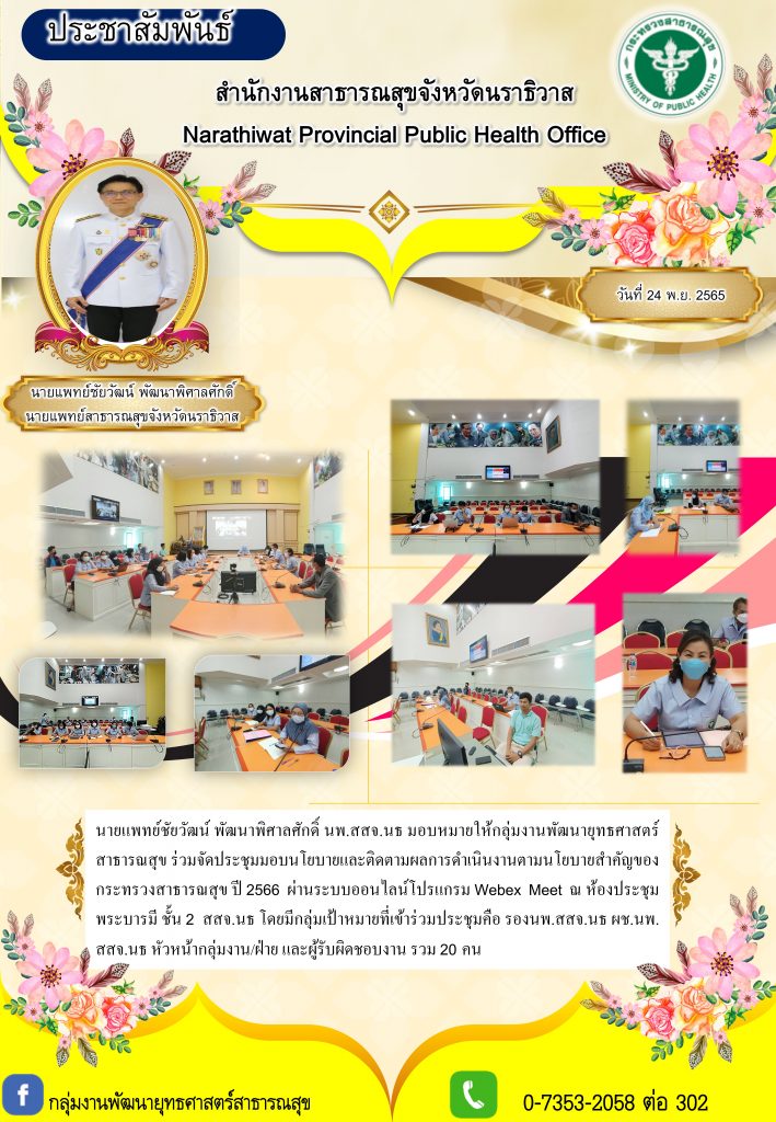 นายแพทย์ชัยวัฒน์ พัฒนาพิศาลศักดิ์ นพ.สสจ.นธ มอบหมายให้กลุ่มงานพัฒนายุทธศาสตร์สาธารณสุข ร่วมจัดประชุมมอบนโยบายและติดตามผลการดำเนินงานตามนโยบายสำคัญของกระทรวงสาธารณสุข ปี 2566 ผ่านระบบออนไลน์โปรแกรม Webex Meet ณ ห้องประชุมพระบารมี ชั้น 20สสจ.นธ โดยมีกลุ่มเป้าหมายที่เข้าร่วมประชุมคือ รองนพ.สสจ.นธ ผช.นพ.สสจ.นธ หัวหน้ากลุ่มงาน/ฝ่าย และผู้รับผิดชอบงาน รวม 20 คน