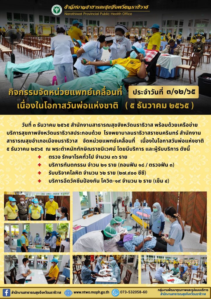 กิจกรรมจัดหน่วยแพทย์เคลื่อนที่ เนื่องในโอกาสวันพ่อแห่งชาติ ๕ ธันวาคม ๒๕๖๕กลุ่มงานพัฒนาคุณภาพและรูปแบบบริการ / 08/12/2022 อ่านแล้ว : 3,040 FacebookFacebookXXLINELine