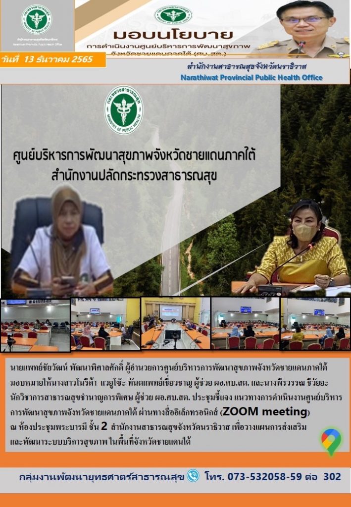 มอบนโยบายการดำเนินงานศูนย์บริหารการะัฒนาสุขภาพจังหวัดชายแดนใต้ (ศบ.สต.)กลุ่มงานพัฒนายุทธศาสตร์ฯ / 14/12/2022 อ่านแล้ว : 2,962 FacebookFacebookXXLINELine