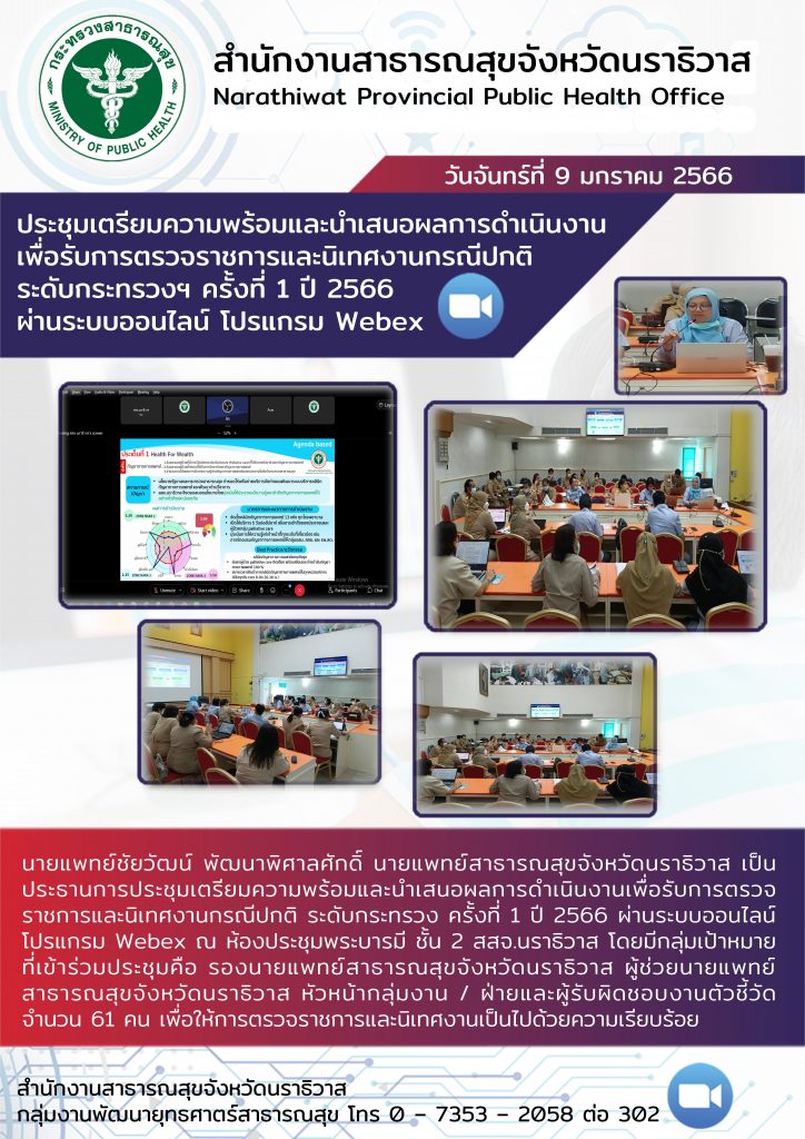 นายแพทย์ชัยวัฒน์ พัฒนาพิศาลศักดิ์ นายแพทย์สาธารณสุขจังหวัดนราธิวาส เป็นประธานการประชุมเตรียมความพร้อมและนำเสนอผลการดำเนินงานเพื่อรับการตรวจราชการและนิเทศงานกรณีปกติ ระดับกระทรวง ครั้งที่ 1 ปี 2566 ผ่านระบบออนไลน์ โปรแกรม Webex ณ ห้องประชุมพระบารมี ชั้น 2 สสจ.นราธิวาส โดยมีกลุ่มเป้าหมาย ที่เข้าร่วมประชุมคือ รองนายแพทย์สาธารณสุขจังหวัดนราธิวาส ผู้ช่วยนายแพทย์สาธารณสุขจังหวัดนราธิวาส หัวหน้ากลุ่มงาน / ฝ่ายและผู้รับผิดชอบงานตัวชี้วัด จำนวน 61 คน เพื่อให้การตรวจราชการและนิเทศงานเป็นไปด้วยความเรียบร้อย
