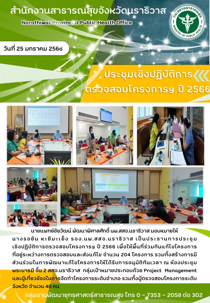 นายแพทย์ชัยวัฒน์ พัฒนาพิศาลศักดิ์ นพ.สสจ.นราธิวาส มอบหมายให้นางรอยัน หะยีมะเย็ง รอง.นพ.สสจ.นราธิวาส เป็นประธานการประชุม เชิงปฏิบัติการตรวจสอบโครงการฯ ปี 2566 เพื่อให้พื้นที่ร่วมกันแก้ไขโครงการที่อยู่ระหว่างการตรวจสอบและส่งแก้ไข จำนวน 204 โครงการ รวมทั้งสร้างการมี ส่วนร่วมในการพัฒนาแก้ไขโครงการให้ได้รับการอนุมัติทันเวลา ณ ห้องประชุมพระบารมี ชั้น 2 สสจ.นราธิวาส กลุ่มเป้าหมายประกอบด้วย Project Management และผู้เกี่ยวข้องในการจัดทำโครงการระดับอำเภอ รวมทั้งผู้ตรวจสอบโครงการระดับจังหวัด จำนวน 40 คน