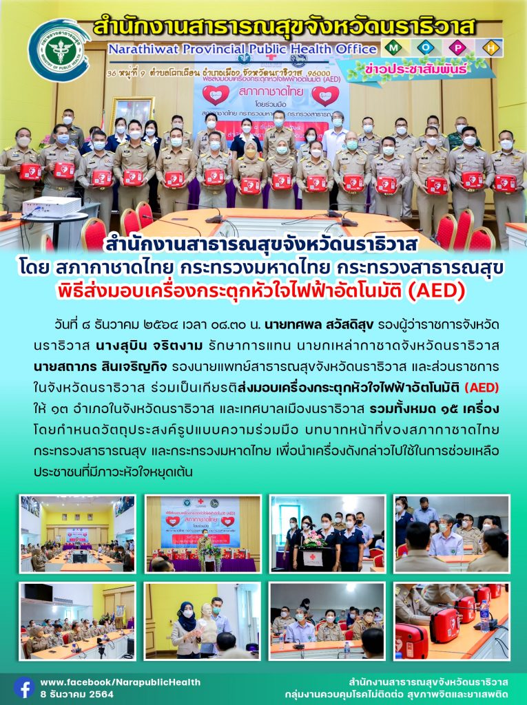 สำนักงานสาธารณสุขจังหวัดนราธิวาส โดย สภากาชาดไทย กระทรวงมหาดไทย กระทรวงสาธารณสุข พิธีส่งมอบเครื่องกระตุกหัวใจไฟฟ้าอัตโนมัติ (AED)กลุ่มงานควบคุมโรคไม่ติดต่อ สุขภาพจิตและยาเสพติด / 20/02/2023 อ่านแล้ว : 2,990 FacebookFacebookXXLINELine