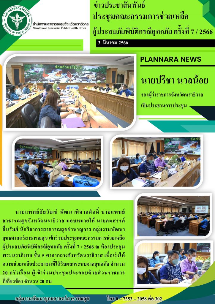 นายแพทย์ชัยวัฒน์ พัฒนาพิศาลศักดิ์ นายแพทย์สาธารณสุขจังหวัดนราธิวาส มอบหมายให้ นายคมสรรค์ ชื่นรัมย์ นักวิชาการสาธารณสุขชำนาญการ กลุ่มงานพัฒนายุทธศาสตร์สาธารณสุข เข้าร่วมประชุมคณะกรรมการช่วยเหลือ ผู้ประสบภัยพิบัติกรณีอุทกภัย ครั้งที่ 7 / 2566 ณ ห้องประชุมพระนราภิบาล ชั้น 5 ศาลากลางจังหวัดนราธิวาส เพื่อเร่งให้ความช่วยเหลือประชาชนที่ได้รับผลกระทบจากอุทกภัย จำนวน 20 ครัวเรือน ผู้เข้าร่วมประชุมประกอบด้วยส่วนราชการที่เกี่ยวข้อง จำนวน 20 คน