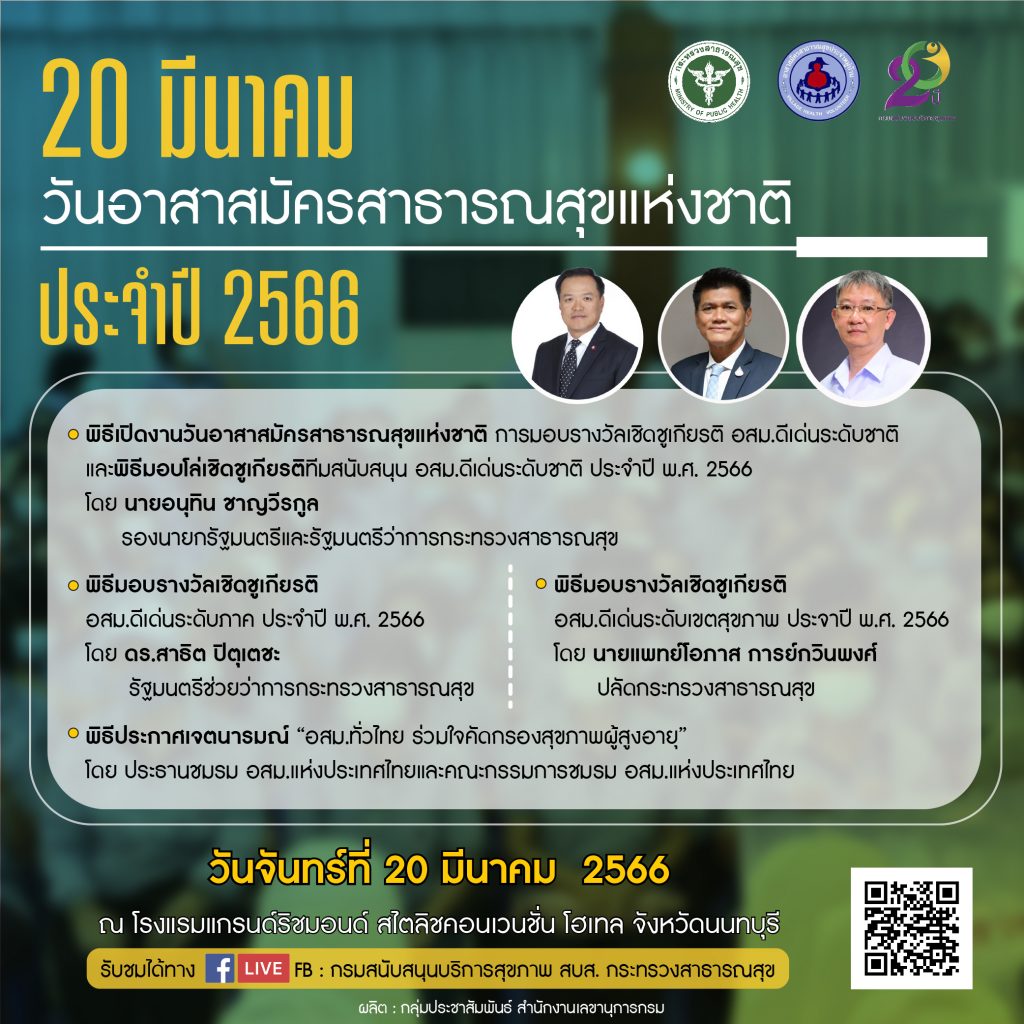 20 มีนาคม วันอาสาสมัครสาธารณสุขแห่งชาติ ประจำปี 2566กลุ่มงานพัฒนาคุณภาพและรูปแบบบริการ / 14/03/2023 อ่านแล้ว : 2,864 FacebookFacebookXXLINELine