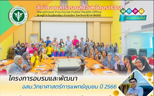 วันที่ 22 มีนาคม 2566 ศูนย์วิทยาศาสตร์การแพทย์ที่ 12 สงขลา ร่วมกับ กลุ่มงานคุ้มครองผู้บริโภคและเภสัชสาธารณสุข ได้จัดโครงการอบรมและพัฒนา อสม.วิทยาสตร์การแพทย์ชุมชน ปี 2566”โดยมีนพ.ชัยวัฒน์ พัฒนาพิศาลศักดิ์นายแพทย์สาธารณสุขจังหวัดนราธิวาส เป็นประธานในพิธีเปิด และภก.อดุล บินยูโซะ รองนายแพทย์สาธารณสุขจังหวัดนราธิวาส เป็นเกียรติเข้าร่วมโครงการ ณ ห้องประชุมพระบารมี สำนักงานสาธารณสุขจังหวัดนราธิวาส อำเภอเมืองนราธิวาส จังหวัดนราธิวาส มีกลุ่มเป้าหมายเป็น อสม./ อสม.หมอประจำบ้าน ในพื้นที่จังหวัดนราธิวาส จำนวน 50 คน และเจ้าหน้าที่ผู้รับผิดชอบของสำนักงานสาธารณสุขจังหวัดนราธิวาส