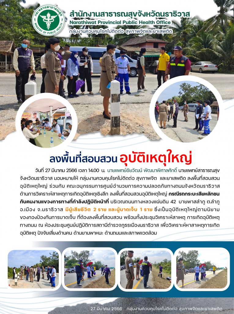 วันที่ 27 มีนาคม 2566 เวลา 14.00 น. นายแพทย์ชัยวัฒน์ พัฒนาพิศาลศักดิ์ นายแพทย์สาธารณสุขจังหวัดนราธิวาส มอบหมายให้ กลุ่มงานควบคุมโรคไม่ติดต่อ สุขภาพจิต และยาเสพติด ลงพื้นที่สอบสวนอุบัติเหตุใหญ่ ร่วมกับ คณะอนุกรรมการศูนย์อำนวยการความปลอดภัยทางถนนจังหวัดนราธิวาส ด้านการวิเคราะห์สาเหตุการเกิดอุบัติเหตุเชิงลึก ลงพื้นที่สอบสวนอุบัติเหตุใหญ่ กรณีรถกระบะเสียหลักชนกับคนงานแขวงการทางที่กำลังปฏิบัติหน้าที่ บริเวณถนนทางหลวงแผ่นดิน 42บายพาสลำภู ต.ลำภู อ.เมือง จ.นราธิวาส มีผู้เสียชีวิต 2 ราย และผู้บาดเจ็บ 1 ราย ซึ่งเป็นอุบัติเหตุใหญ่ตามนิยามของกองป้องกันการบาดเจ็บ ที่ต้องลงพื้นที่สอบสวน พร้อมทั้งประชุมวิเคราะห์สาเหตุ การเกิดอุบัติเหตุทางถนน ณ ห้องประชุมศูนย์ปฏิบัติการสถานีตำรวจภูธรเมืองนราธิวาส เพื่อวิเคราะห์หาสาเหตุการเกิดอุบัติเหตุ ปัจจัยเสี่ยงด้านคน ด้านยานพาหนะ ด้านถนนและสภาพแวดล้อม