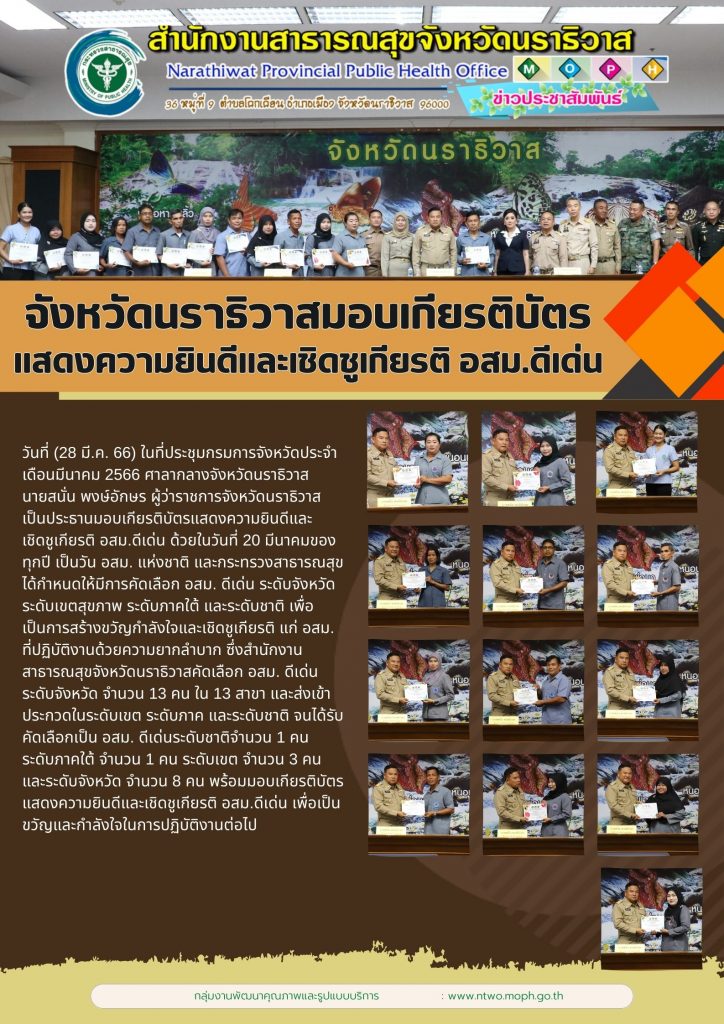 จังหวัดนราธิวาสมอบเกียรติบัตรแสดงความยินดีและเชิดชูเกียรติ อสม. ดีเด่นกลุ่มงานพัฒนาคุณภาพและรูปแบบบริการ / 03/04/2023 อ่านแล้ว : 2,748 FacebookFacebookXXLINELine
