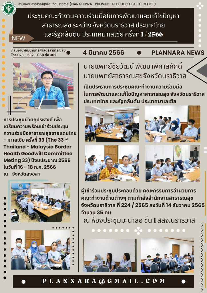 นายแพทย์ชัยวัฒน์ พัฒนาพิศาลศักดิ์ นายแพทย์สาธารณสุขจังหวัดนราธิวาสเป็นประธานการประชุมคณะทำงานความร่วมมือ ในการพัฒนาและแก้ไขปัญหาสาธารณสุข จังหวัดนราธิวาสประเทศไทย และรัฐกลันตัน ประเทศมาเลเซียผู้เข้าร่วมประชุมประกอบด้วย คณะกรรมการอำนวยการคณะทำงานด้านต่างๆ ตามคำสั่งสำนักงานสาธารณสุขจังหวัดนราธิวาส ที่ 224 / 2565 ลงวันที่ 14 ธันวาคม 2565 จำนวน 35 คน ณ ห้องประชุมมะนาลอ ชั้น 1 สสจ.นราธิวาส การประชุมมีวัตถุประสงค์ เพื่อเตรียมความพร้อมเข้าร่วมประชุมความร่วมมือสาธารณสุขชายแดนไทย – มาเลเซีย ครั้งที่ 33 (The 33 ʳᵈ Thailand – Malaysia Border Health Goodwill Committee Meting 33) ปีงบประมาณ 2566 ในวันที่ 16 – 18 ก.ค. 2566 ณ จังหวัดสงขลา