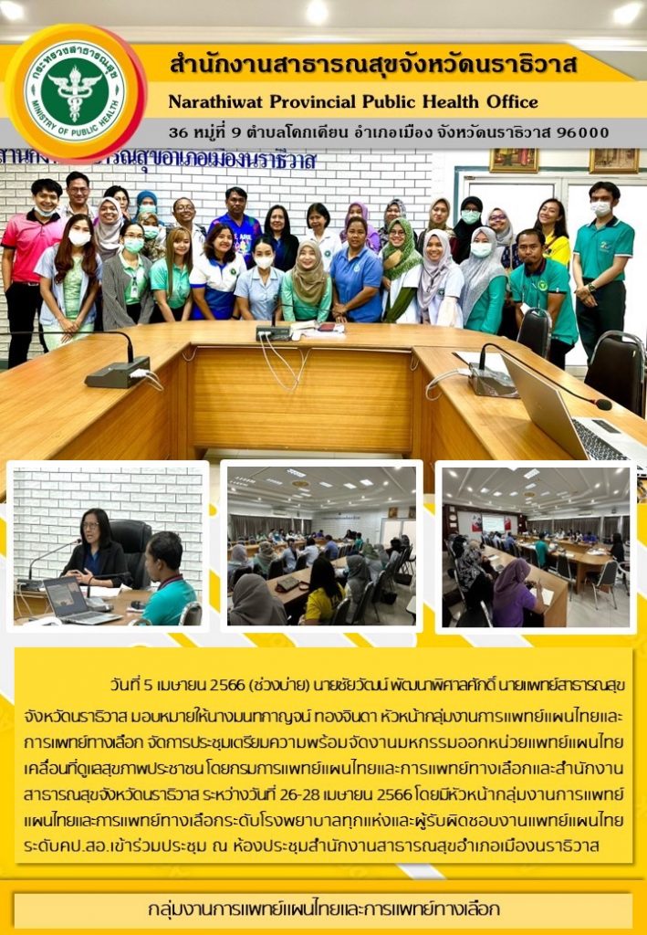 วันที่ 5 เมษายน 2566 (ช่วงบ่าย) นายชัยวัฒน์ พัฒนาพิศาลศักดิ์ นายแพทย์สาธารณสุขจังหวัดนราธิวาส มอบหมายให้นางมนทกาญจน์ ทองจินดา หัวหน้ากลุ่มงานการแพทย์แผนไทยและการแพทย์ทางเลือก จัดการประชุมเตรียมความพร้อมจัดงานมหกรรมออกหน่วยแพทย์แผนไทยเคลื่อนที่ดูแลสุขภาพประชาชน โดยกรมการแพทย์แผนไทยและการแพทย์ทางเลือกและสำนักงานสาธารณสุขจังหวัดนราธิวาส ระหว่างวันที่ 26-28 เมษายน 2566 โดยมีหัวหน้ากลุ่มงานการแพทย์แผนไทยและการแพทย์ทางเลือกระดับโรงพยาบาลทุกแห่งและผู้รับผิดชอบงานแพทย์แผนไทยระดับคป.สอ.เข้าร่วมประชุม ณ ห้องประชุมสำนักงานสาธารณสุขอำเภอเมืองนราธิวาส