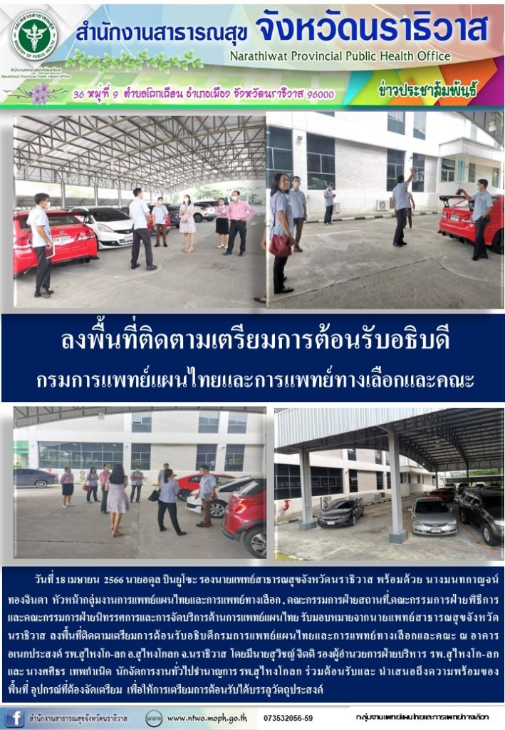 วันที่ 18 เมษายน 2566 นายอดุล บินยูโซะ รองนายแพทย์สาธารณสุขจังหวัดนราธิวาส พร้อมด้วย นางมนทกาญจน์ ทองจินดา หัวหน้ากลุ่มงานการแพทย์แผนไทยและการแพทย์ทางเลือก , คณะกรรมการฝ่ายสถานที่,คณะกรรมการฝ่ายพิธีการและคณะกรรมการฝ่ายนิทรรศการและการจัดบริการด้านการแพทย์แผนไทย รับมอบหมายจากนายแพทย์สาธารณสุขจังหวัดนราธิวาส ลงพื้นที่ติดตามเตรียมการต้อนรับอธิบดีกรมการแพทย์แผนไทยและการแพทย์ทางเลือกและคณะ ณ อาคารอเนกประสงค์