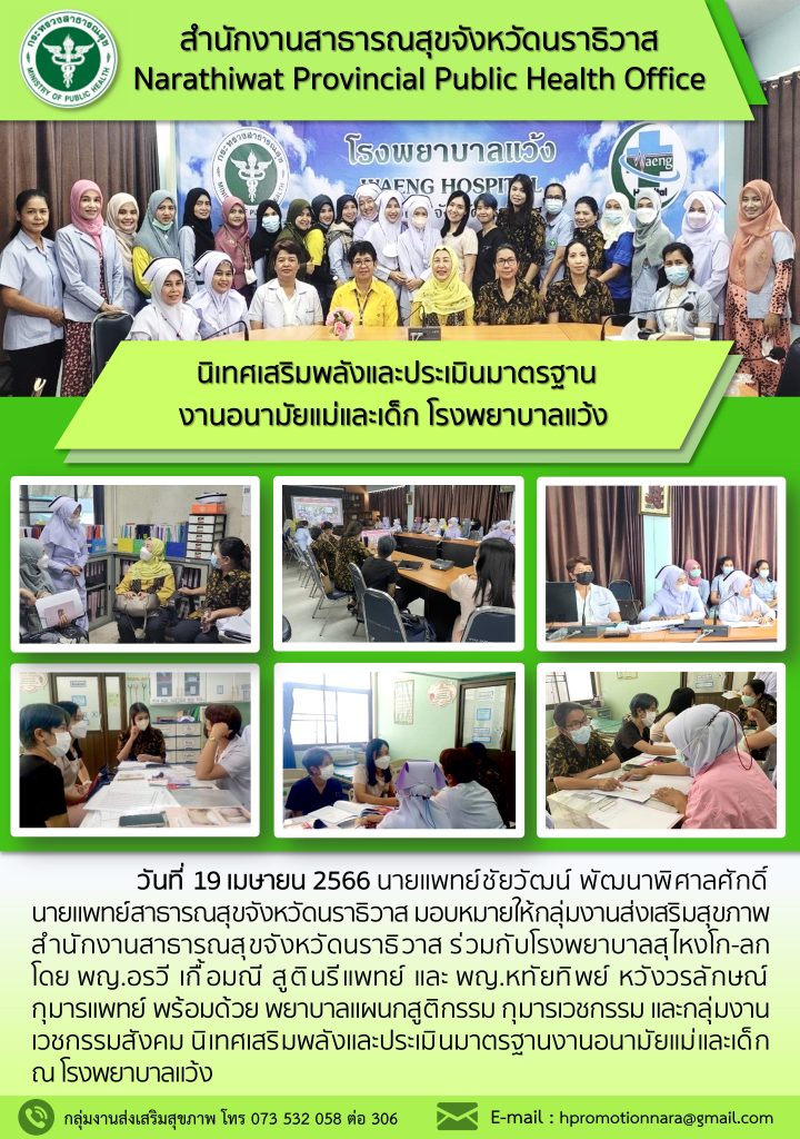 วันที่ 19 เมษายน 2566 นายแพทย์ชัยวัฒน์ พัฒนาพิศาลศักดิ์ นายแพทย์สาธารณสุขจังหวัดนราธิวาส มอบหมายให้กลุ่มงานส่งเสริมสุขภาพ สำนักงานสาธารณสุขจังหวัดนราธิวาส ร่วมกับโรงพยาบาลสุไหงโก-ลก โดย พญ.อรวี เกื้อมณี สูตินรีแพทย์ และ พญ.หทัยทิพย์ หวังวรลักษณ์ กุมารแพทย์ พร้อมด้วย พยาบาลแผนกสูติกรรม กุมารเวชกรรม และกลุ่มงานเวชกรรมสังคม นิเทศเสริมพลังและประเมินมาตรฐานงานอนามัยแม่และเด็ก ณ โรงพยาบาลแว้ง