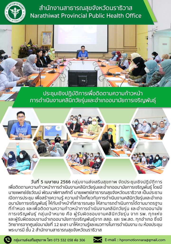 วันที่ 5 เมษายน 2566 กลุ่มงานส่งเสริมสุขภาพ จัดประชุมเชิงปฏิบัติการเพื่อติดตามความก้าวหน้าการดำเนินงานคลินิกวัยรุ่นและอำเภออนามัยการเจริญพันธุ์ โดยมีนายแพทย์ชัยวัฒน์ พัฒนาพิศาลศักดิ์ นายแพทย์สาธารณสุขจังหวัดนราธิวาส เป็นประธานเปิดการประชุม เพื่อสร้างความรู้ ความเข้าใจเกี่ยวกับการดำเนินงานคลินิกวัยรุ่นและอำเภออนามัยการเจริญพันธุ์ ให้กับเจ้าหน้าที่สาธารณสุข ให้สามารถดำเนินการได้ตามมาตรฐานที่กำหนด และเพื่อติดตามความก้าวหน้าการดำเนินงานคลินิกวัยรุ่น และอำเภออนามัยการเจริญพันธุ์ กลุ่มเป้าหมาย คือ ผู้รับผิดชอบงานคลินิกวัยรุ่น จาก รพ. ทุกแห่ง และผู้รับผิดชอบงานอำเภออนามัยการเจริญพันธุ์จาก สสอ. และ รพ.สต. ทุกอำเภอ ซึ่งมีวิทยากรจากศูนย์อนามัยที่ 12 ยะลา มาให้ความรู้และแนวทางในการดำเนินงาน ณ ห้องประชุมพระบารมี ชั้น 2 สำนักงานสาธารณสุขจังหวัดนราธิวาส