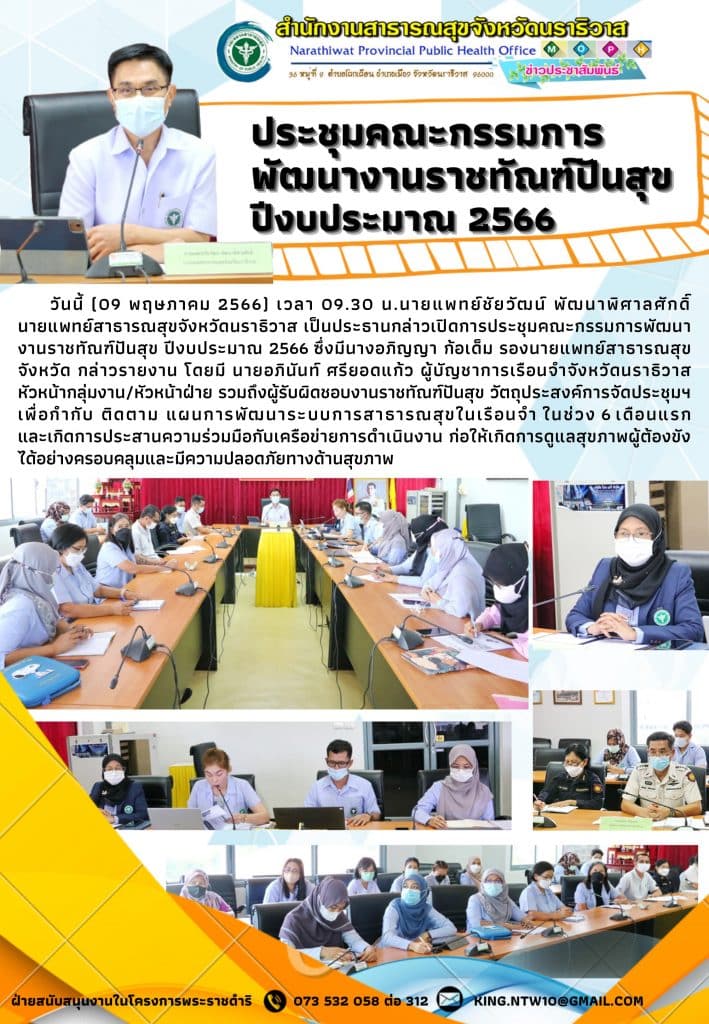 วันนี้ (09 พฤษภาคม 2566) เวลา 09.30 น. นายแพทย์ชัยวัฒน์ พัฒนาพิศาลศักดิ์ นายแพทย์สาธารณสุขจังหวัดนราธิวาส เป็นประธานกล่าวเปิดการประชุมคณะกรรมการพัฒนางานราชทัณฑ์ปันสุข ปีงบประมาณ 2566 ซึ่งมีนางอภิญญา ก้อเด็ม รองนายแพทย์สาธารณสุขจังหวัด กล่าวรายงาน โดยมี นายอภินันท์ ศรียอดแก้ว ผู้บัญชาการเรือนจำจังหวัดนราธิวาส หัวหน้ากลุ่มงาน/หัวหน้าฝ่าย รวมถึงผู้รับผิดชอบงานราชทัณฑ์ปันสุข วัตถุประสงค์การจัดประชุมฯ เพื่อกำกับ ติดตาม แผนการพัฒนาระบบการสาธารณสุขในเรือนจำ ในช่วง 6 เดือนแรก และเกิดการประสานความร่วมมือกับเครือข่ายการดำเนินงาน ก่อให้เกิดการดูแลสุขภาพผู้ต้องขังได้อย่างครอบคลุมและมีความปลอดภัยทางด้านสุขภาพ