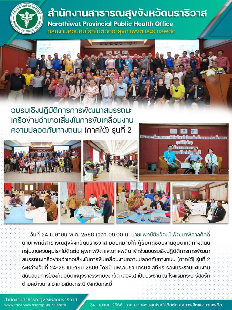 วันที่ 24 เมษายน พ.ศ. 2566 เวลา 09.00 น. นายแพทย์ชัยวัฒน์ พัฒนาพิศาลศักดิ์ นายแพทย์สาธารณสุขจังหวัดนราธิวาส มอบหมายให้ ผู้รับผิดชอบงานอุบัติเหตุทางถนน กลุ่มงานควบคุมโรคไม่ติดต่อ สุขภาพจิต และยาเสพติด เข้าร่วมอบรมเชิงปฏิบัติการการพัฒนา สมรรถนะเครือข่ายอำเภอเสี่ยงในการขับเคลื่อนงานความปลอดภัยทางถนน (ภาคใต้) รุ่นที่ 2 ระหว่างวันที่ 24-25 เมษายน 2566 โดยมี นพ.อนุชา เศรษฐเสถียร รองประธานแผนงานสนับสนุนการป้องกันอุบัติเหตุจราจรระดับจังหวัด (สอจร.) เป็นประธาน ณ โรงแรมกระบี่ รีสอร์ท ตำบลอ่าวนาง อำเภอเมืองกระบี่ จังหวัดกระบี่