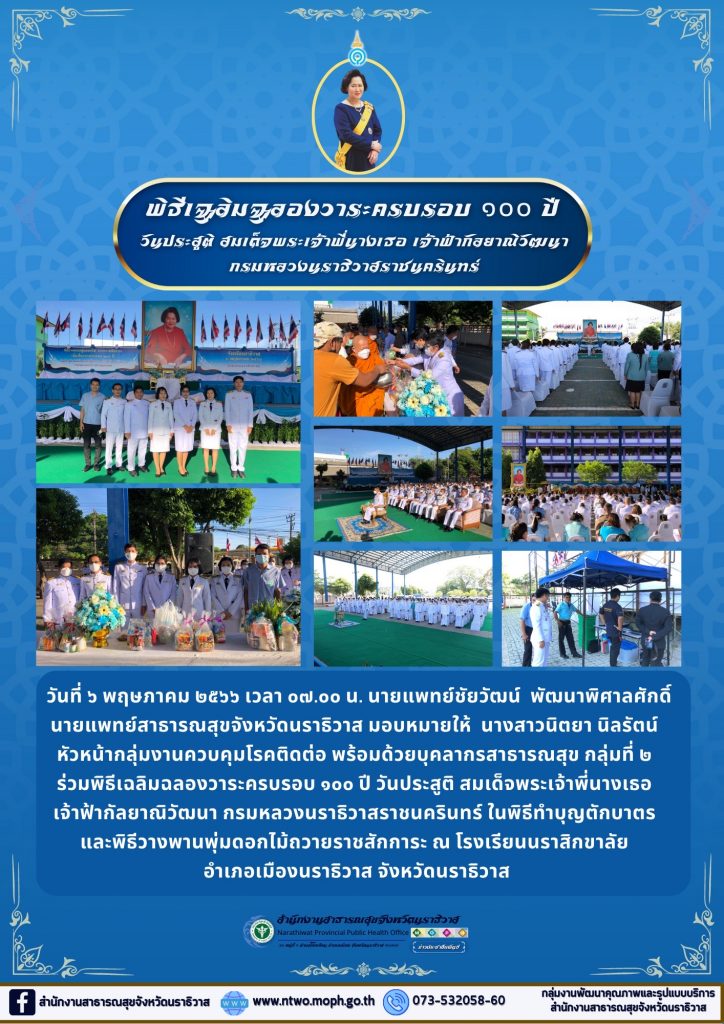 พิธีเฉลิมฉลองวาระครบรอบ ๑๐๐ ปี วันประสูติ สมเด็จพระเจ้าพี่นางเธอ เจ้าฟ้ากัลยาณิวัฒนา กรมหลวงนราธิวาสราชนครินทร์กลุ่มงานพัฒนาคุณภาพและรูปแบบบริการ / 12/05/2023 อ่านแล้ว : 2,388 FacebookFacebookXXLINELine