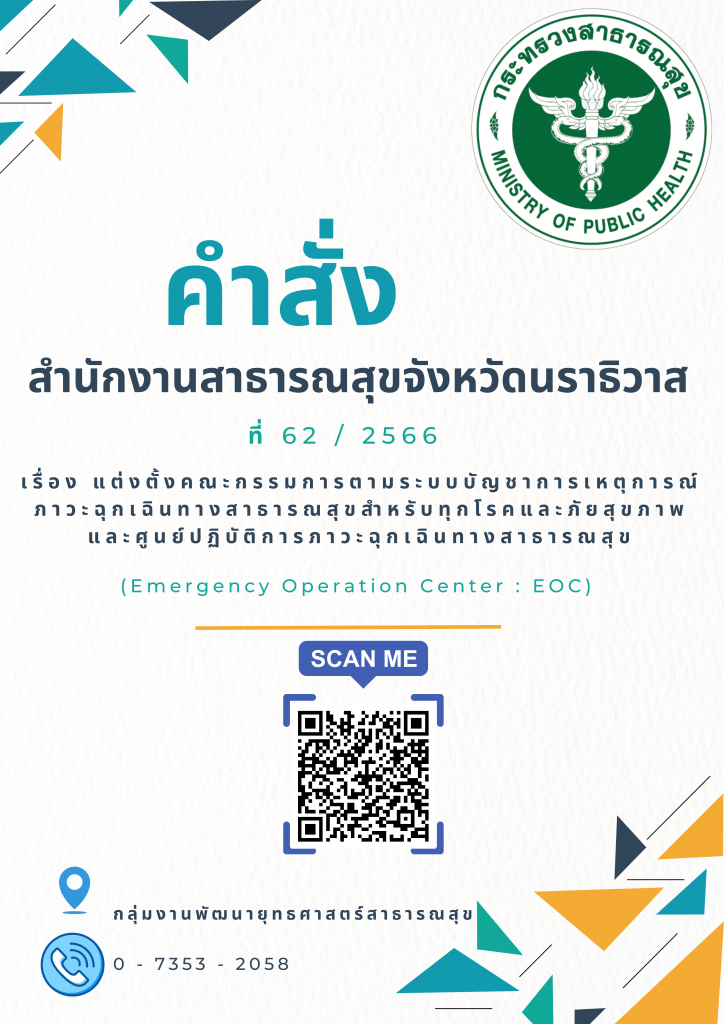 คำสั่งสำนักงานสาธารณสุขจังหวัดนราธิวาส ที่ 62 / 2566 เรื่อง แต่งตั้งคณะกรรมการตามระบบบัญชาการเหตุการณ์ภาวะฉุกเฉินทางสาธารณสุขสำหรับทุกโรคและภัยสุขภาพและศูนย์ปฏิบัติการภาวะฉุกเฉินทางสาธารณสุข (Emergency Operation Center : EOC)