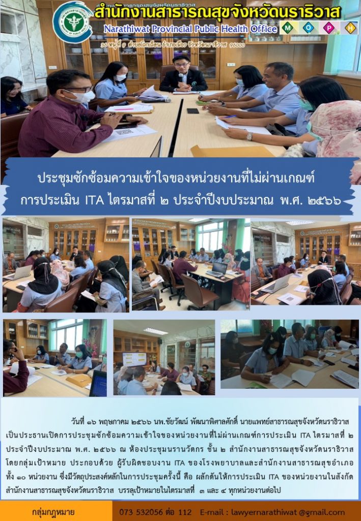 วันที่ ๑๖ พฤษภาคม ๒๕๖๖ นพ.ชัยวัฒน์ พัฒนาพิศาลศักดิ์ นายแพทย์สาธารณสุขจังหวัดนราธิวาส เป็นประธานเปิดการประชุมซักซ้อมความเข้าใจของหน่วยงานที่ไม่ผ่านเกณฑ์การประเมิน ITA ไตรมาสที่ ๒ ประจำปีงบประมาณ พ.ศ. ๒๕๖๖ ณ ห้องประชุมนรานวัตกร ชั้น ๒ สำนักงานสาธารณสุขจังหวัดนราธิวาส โดยกลุ่มเป้าหมาย ประกอบด้วย ผู้รับผิดชอบงาน ITA ของโรงพยาบาลและสำนักงานสาธารณสุขอำเภอ ทั้ง ๑๐ หน่วยงาน ซึ่งมีวัตถุประสงค์หลักในการประชุมครั้งนี้ คือ ผลักดันให้การประเมิน ITA ของหน่วยงานในสังกัดสำนักงานสาธารณสุขจังหวัดนราธิวาส บรรลุเป้าหมายในไตรมาสที่ ๓ และ ๔ ทุกหน่วยงานต่อไป