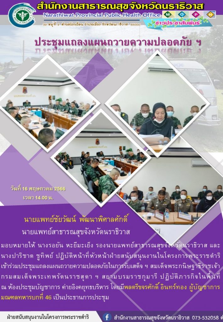 วันนี้ (140566) เวลา 14.00 น. นายแพทย์ชัยวัฒน์ พัฒนาพิศาลศักดิ์ นายแพทย์สาธารณสุขจังหวัดนราธิวาส มอบหมายให้ นางรอยัน หะยีมะเย็ง รองนายแพทย์สาธารณสุขจังหวัดนราธิวาส และนางปาริชาต ชูทิพย์ ปฏิบัติหน้าที่หัวหน้าฝ่ายสนับสนุนงานในโครงการพระราชดำริ เข้าร่วมประชุมแถลงแผนถวายความปลอดภัยในการรับเสด็จฯ สมเด็จพระกนิษฐาธิราชเจ้า กรมสมเด็จพระเทพรัตนราชสุดาฯ สยามบรมราชกุมารี ปฏิบัติภารกิจในพื้นที่ ณ ห้องประชุมบัญชาการ ค่ายอิงคยุทธบริหาร โดยมีพลตรีขจรศักดิ์ อินทร์ทอง ผู้บัญชาการมณฑลทหารบกที่ 46 เป็นประธานการประชุม