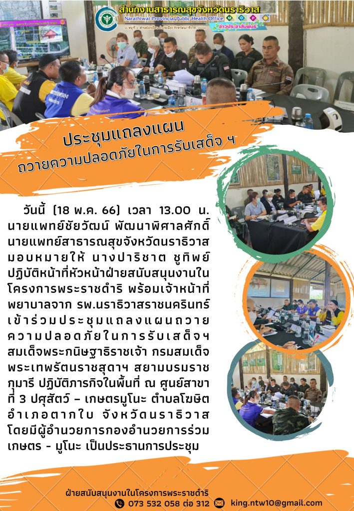 วันนี้ (18 พ.ค. 66) เวลา 13.00 น. นายแพทย์ชัยวัฒน์ พัฒนาพิศาลศักดิ์ นายแพทย์สาธารณสุขจังหวัดนราธิวาส มอบหมายให้ นางปาริชาต ชูทิพย์ ปฏิบัติหน้าที่หัวหน้าฝ่ายสนับสนุนงานในโครงการพระราชดำริ พร้อมเจ้าหน้าที่พยาบาลจาก รพ.นราธิวาสราชนครินทร์เข้าร่วมประชุมแถลงแผนถวายความปลอดภัยในการรับเสด็จ ฯ สมเด็จพระกนิษฐาธิราชเจ้า กรมสมเด็จพระเทพรัตนราชสุดา ฯ สยามบรมราชกุมารี ปฏิบัติภารกิจในพื้นที่ ณ ศูนย์สาขาที่ 3 ปศุสัตว์ – เกษตรมูโนะ ตำบลโฆษิต อำเภอตากใบ จังหวัดนราธิวาส โดยมีผู้อำนวยการกองอำนวยการร่วมเกษตร – มูโนะ เป็นประธานการประชุม