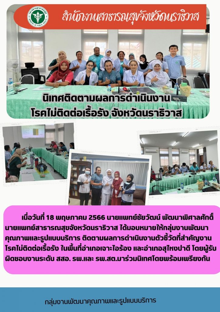 นิเทศติดตามผลการดำเนินงานโรคไม่ติดต่อเรื้อรัง จังหวัดนราธิวาสกลุ่มงานพัฒนาคุณภาพและรูปแบบบริการ / 25/05/2023 อ่านแล้ว : 2,506 FacebookFacebookXXLINELine