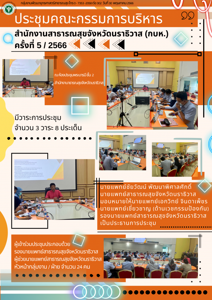 นายแพทย์ชัยวัฒน์ พัฒนาพิศาลศักดิ์ นายแพทย์สาธารณสุขจังหวัดนราธิวาส มอบหมายให้นายแพทย์เอกวิทย์ จินดาเพ็ชร นายแพทย์เชี่ยวชาญ (ด้านเวชกรรมป้องกัน) รองนายแพทย์สาธารณสุขจังหวัดนราธิวาสเป็นประธานการประชุม ผู้เข้าร่วมประชุมประกอบด้วย รองนายแพทย์สาธารณสุขจังหวัดนราธิวาส ผู้ช่วยนายแพทย์สาธารณสุขจังหวัดนราธิวาส หัวหน้ากลุ่มงาน / ฝ่าย จำนวน 24 คน