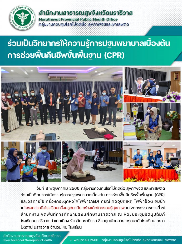 วันที่ 8 พฤษภาคม 2566 กลุ่มงานควบคุมโรคไม่ติดต่อ สุขภาพจิต และยาเสพติดร่วมเป็นวิทยากรให้ความรู้การปฐมพยาบาลเบื้องต้น การช่วยฟื้นคืนชีพขั้นพื้นฐาน (CPR)และวิธีการใช้เครื่องกระตุกหัวใจไฟฟ้า(AED) กรณีเกิดอุบัติเหตุ ไฟฟ้าช็อต จมน้ำ ในโครงการหนึ่งโรงเรียนหนึ่งครูอนามัย สร้างเด็กไทยรอบรู้สุขภาพ ในเขตตรวจราชการที่ 7 สำนักงานเขตพื้นที่การศึกษามัธยมศึกษานราธิวาส ณ ห้องประชุมรัตนูปถัมภ์ โรงเรียนนราธิวาส อำเภอเมือง จังหวัดนราธิวาส ซึ่งกลุ่มเป้าหมาย ครูอนามัยโรงเรียน ยะลา ปัตตานี นราธิวาส จำนวน 46 โรงเรียน