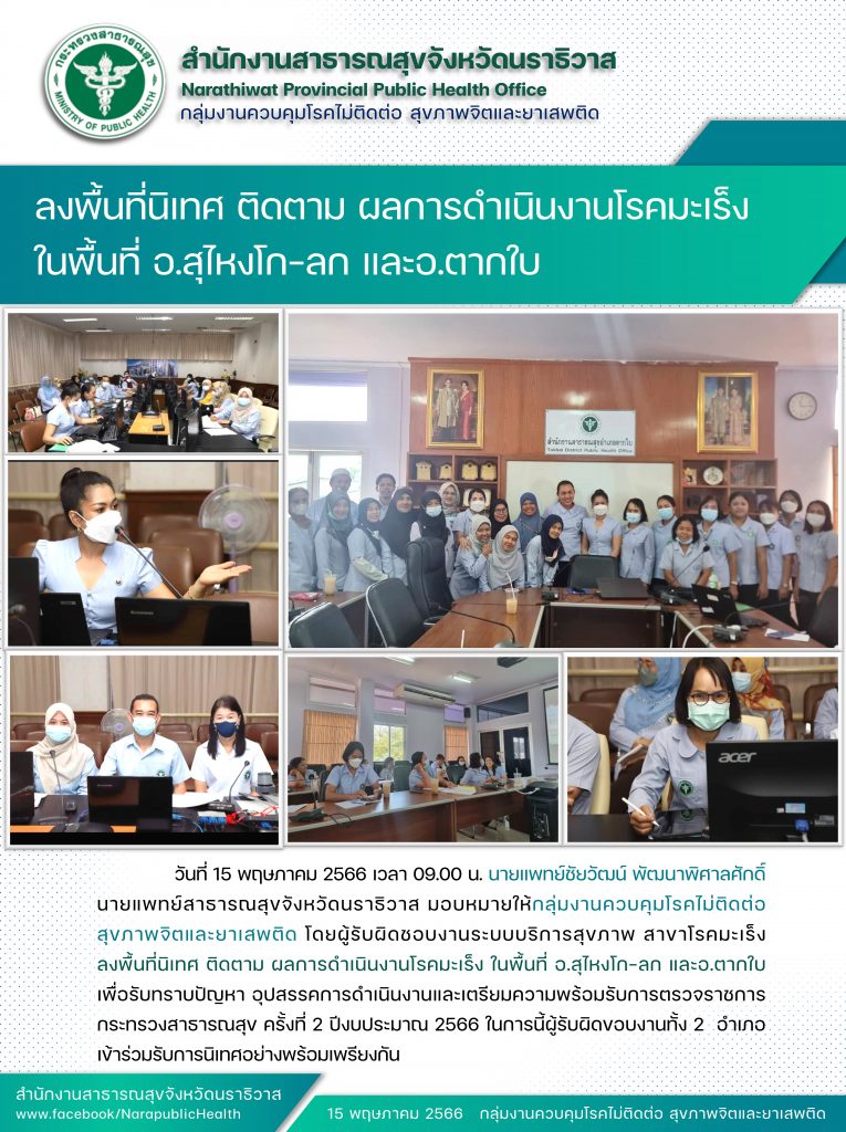 วันที่ 15 พฤษภาคม 2566 เวลา 09.00 น. นายแพทย์ชัยวัฒน์ พัฒนาพิศาลศักดิ์ นายแพทย์สาธารณสุขจังหวัดนราธิวาส มอบหมายให้กลุ่มงานควบคุมโรคไม่ติดต่อ สุขภาพจิตและยาเสพติด โดยผู้รับผิดชอบงานระบบบริการสุขภาพ สาขาโรคมะเร็ง ลงพื้นที่นิเทศ ติดตาม ผลการดำเนินงานโรคมะเร็ง ในพื้นที่ อ.สุไหงโก-ลก และอ.ตากใบ เพื่อรับทราบปัญหา อุปสรรคการดำเนินงานและเตรียมความพร้อมรับการตรวจราชการกระทรวงสาธารณสุข ครั้งที่ 2 ปีงบประมาณ 2566 ในการนี้ผู้รับผิดขอบงานทั้ง 2 อำเภอเข้าร่วมรับการนิเทศอย่างพร้อมเพรียงกัน