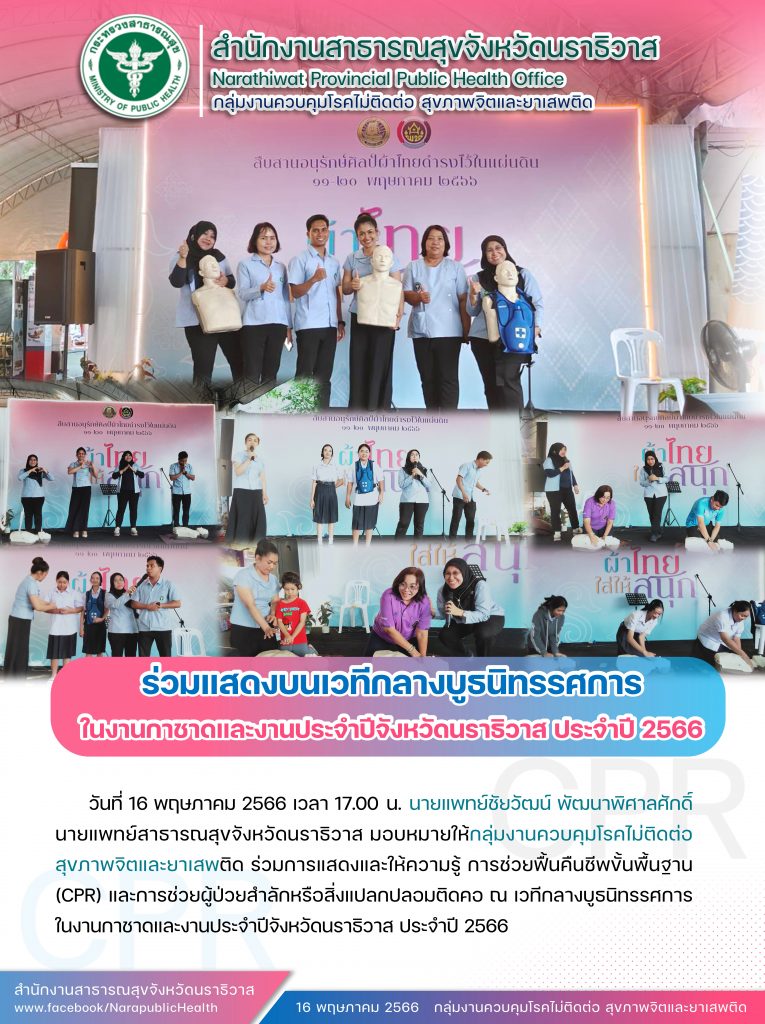 วันที่ 16 พฤษภาคม 2566 เวลา 09.00 น. นายแพทย์ชัยวัฒน์ พัฒนาพิศาลศักดิ์ นายแพทย์สาธารณสุขจังหวัดนราธิวาส มอบหมายให้กลุ่มงานควบคุมโรคไม่ติดต่อ สุขภาพจิตและยาเสพติด ร่วมการแสดงและให้ความรู้ การช่วยฟื้นคืนชีพขั้นพื้นฐาน และการช่วยผู้ป่วยสำลักหรือสิ่งแปลกปลอมติดคอ ณ เวทีกลางบูธนิทรรศการ ในงานกาชาดและงานประจำปีจังหวัดนราธิวาส ประจำปี 2566