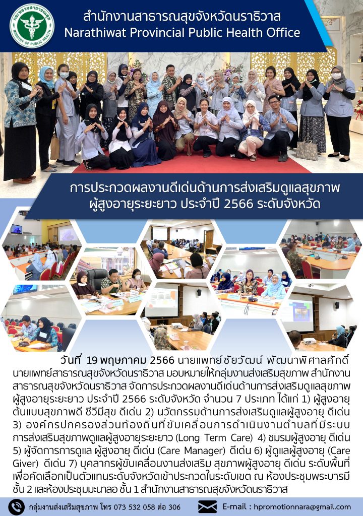 วันที่ 19 พฤษภาคม 2566 นายแพทย์ชัยวัฒน์ พัฒนาพิศาลศักดิ์ นายแพทย์สาธารณสุขจังหวัดนราธิวาส มอบหมายให้กลุ่มงานส่งเสริมสุขภาพ สำนักงานสาธารณสุขจังหวัดนราธิวาส จัดการประกวดผลงานดีเด่นด้านการส่งเสริมดูแลสุขภาพผู้สูงอายุระยะยาว ประจำปี 2566 ระดับจังหวัด จำนวน 7 ประเภท ได้แก่ 1) ผู้สูงอายุต้นแบบสุขภาพดี ชีวีมีสุข ดีเด่น 2) นวัตกรรมด้านการส่งเสริมดูแลผู้สูงอายุ ดีเด่น 3) องค์กรปกครองส่วนท้องถิ่นที่ขับเคลื่อนการดำเนินงานตำบลที่มีระบบ การส่งเสริมสุขภาพดูแลผู้สูงอายุระยะยาว (Long Term Care) 4) ชมรมผู้สูงอายุ ดีเด่น 5) ผู้จัดการการดูแล ผู้สูงอายุ ดีเด่น (Care Manager) ดีเด่น 6) ผู้ดูแลผู้สูงอายุ (Care Giver) ดีเด่น 7) บุคลากรผู้ขับเคลื่อนงานส่งเสริม สุขภาพผู้สูงอายุ ดีเด่น ระดับพื้นที่เพื่อคัดเลือกเป็นตัวแทนระดับจังหวัดเข้าประกวดในระดับเขต ณ ห้องประชุมพระบารมี ชั้น 2 และห้องประชุมมะนาลอ ชั้น 1 สำนักงานสาธารณสุขจังหวัดนราธิวาส