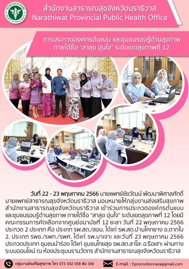 วันที่ 22 – 23 พฤษภาคม 2566 นายแพทย์ชัยวัฒน์ พัฒนาพิศาลศักดิ์ นายแพทย์สาธารณสุขจังหวัดนราธิวาส มอบหมายให้กลุ่มงานส่งเสริมสุขภาพ สำนักงานสาธารณสุขจังหวัดนราธิวาส เข้าร่วมการประกวดองค์กรต้นแบบ และชุมชนรอบรู้ด้านสุขภาพ ภายใต้ชื่อ “สาสุข อุ่นใจ” ระดับเขตสุขภาพที่ 12 โดยมีคณะกรรมการคัดเลือกจากศูนย์อนามัยที่ 12 ยะลา วันที่ 22 พฤษภาคม 2566 ประกวด 2 ประเภท คือ ประเภท รพ.สต./สอน. ได้แก่ รพ.สต.บ้านโคกยาง อ.ตากใบ 2. ประเภท รพช./รพท./รพศ. ได้แก่ รพ.บาเจาะ และวันที่ 23 พฤษภาคม 2566 ประกวดประเภท ชุมชนนำร่อง ได้แก่ ชุมชนไทยสุข รพ.สต.ลาโละ อ.รือเสาะ ผ่านทางระบบออนไลน์ ณ ห้องประชุมนรานวัตกร สำนักงานสาธารณสุขจังหวัดนราธิวาส