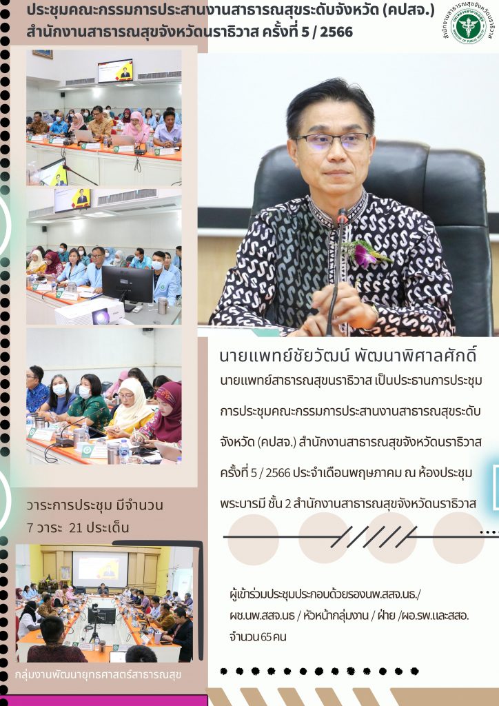 วันที่ 2 มิ.ย. 66 นายแพทย์ชัยวัฒน์ พัฒนาพิศาลศักดิ์ นายแพทย์สาธารณสุขนราธิวาส เป็นประธานการประชุมคณะกรรมการประสานงานสาธารณสุขระดับจังหวัด (คปสจ.) สำนักงานสาธารณสุขจังหวัดนราธิวาส ครั้งที่ 5 / 2566 ประจำเดือนพฤษภาคม ณ ห้องประชุม พระบารมี ชั้น 2 สำนักงานสาธารณสุขจังหวัดนราธิวาส ผู้เข้าร่วมประชุมประกอบด้วยรองนพ.สสจ.นธ./ ผช.นพ.สสจ.นธ / หัวหน้ากลุ่มงาน / ฝ่าย /ผอ.รพ.และสสอ. จำนวน 65 คน วาระการประชุม มีจำนวน 7 วาระ 21 ประเด็น