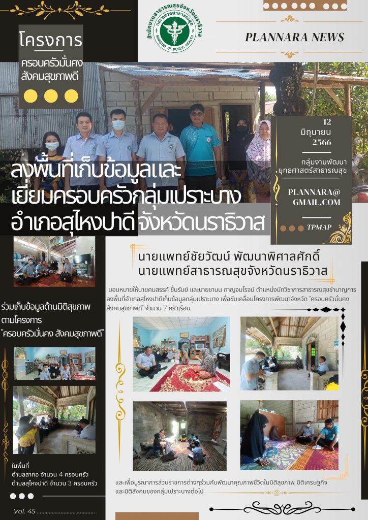นายแพทย์ชัยวัฒน์ พัฒนาพิศาลศักดิ์ นายแพทย์สาธารณสุขจังหวัดนราธิวาส มอบหมายให้นายคมสรรค์ ชื่นรัมย์ และนายชานน กาญจนโรจน์ ตำแหน่งนักวิชาการสาธารณสุขชำนาญการ ลงพื้นที่อำเภอสุไหงปาดีเก็บข้อมูลกลุ่มเปราะบาง เพื่อขับเคลื่อนโครงการพัฒนาจังหวัด “ครอบครัวมั่นคง สังคมสุขภาพดี” จำนวน 7 ครัวเรือน