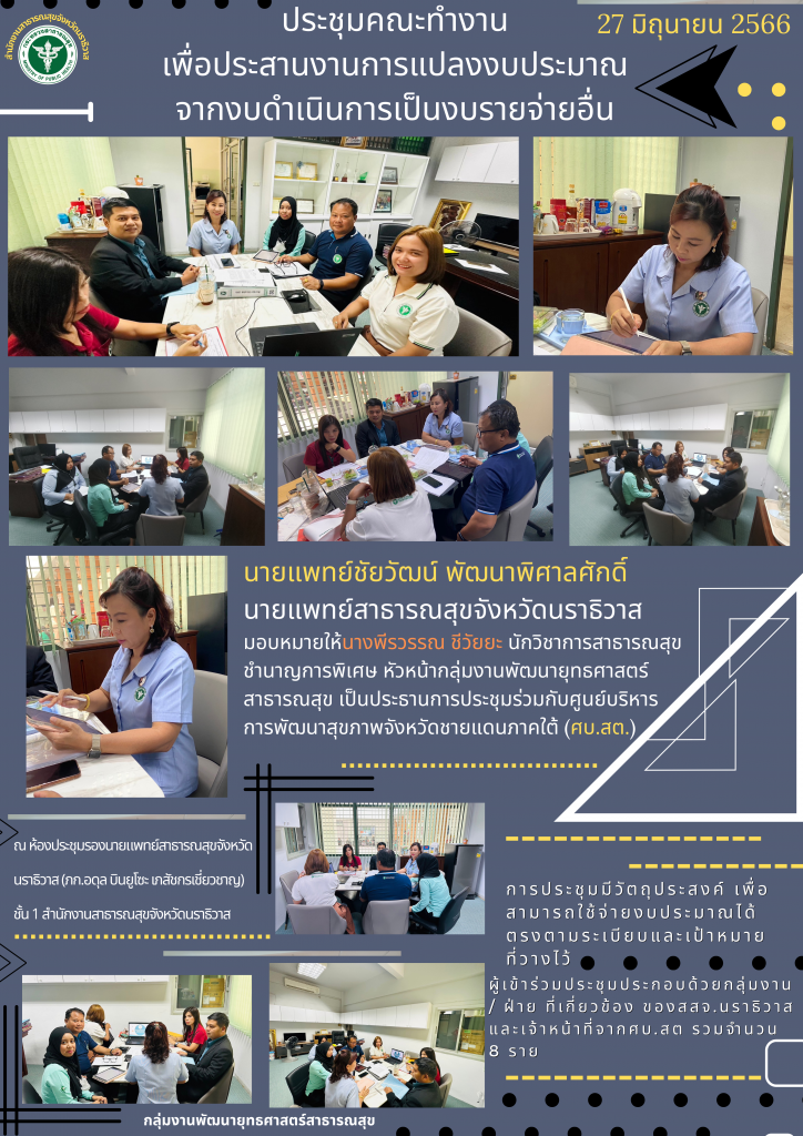 นายแพทย์ชัยวัฒน์ พัฒนาพิศาลศักดิ์ นายแพทย์สาธารณสุขจังหวัดนราธิวาส มอบหมายให้นางพีรวรรณ ชีวัยยะ นักวิชาการสาธารณสุขชำนาญการพิเศษ หัวหน้ากลุ่มงานพัฒนายุทธศาสตร์สาธารณสุข เป็นประธานการประชุมร่วมกับศูนย์บริหารการพัฒนาสุขภาพจังหวัดชายแดนภาคใต้ (ศบ.สต.) ณ ห้องประชุมรองนายแพทย์สาธารณสุขจังหวัดนราธิวาส (ภก.อดุล บินยูโซะ เภสัชกรเชี่ยวชาญ) ชั้น 1 สำนักงานสาธารณสุขจังหวัดนราธิวาสการประชุมมีวัตถุประสงค์ เพื่อสามารถใช้จ่ายงบประมาณได้ตรงตามระเบียบและเป้าหมายที่วางไว้ ผู้เข้าร่วมประชุมประกอบด้วยกลุ่มงาน / ฝ่าย ที่เกี่ยวข้อง ของสสจ.นราธิวาส และเจ้าหน้าที่จากศบ.สต รวมจำนวน 8 ราย