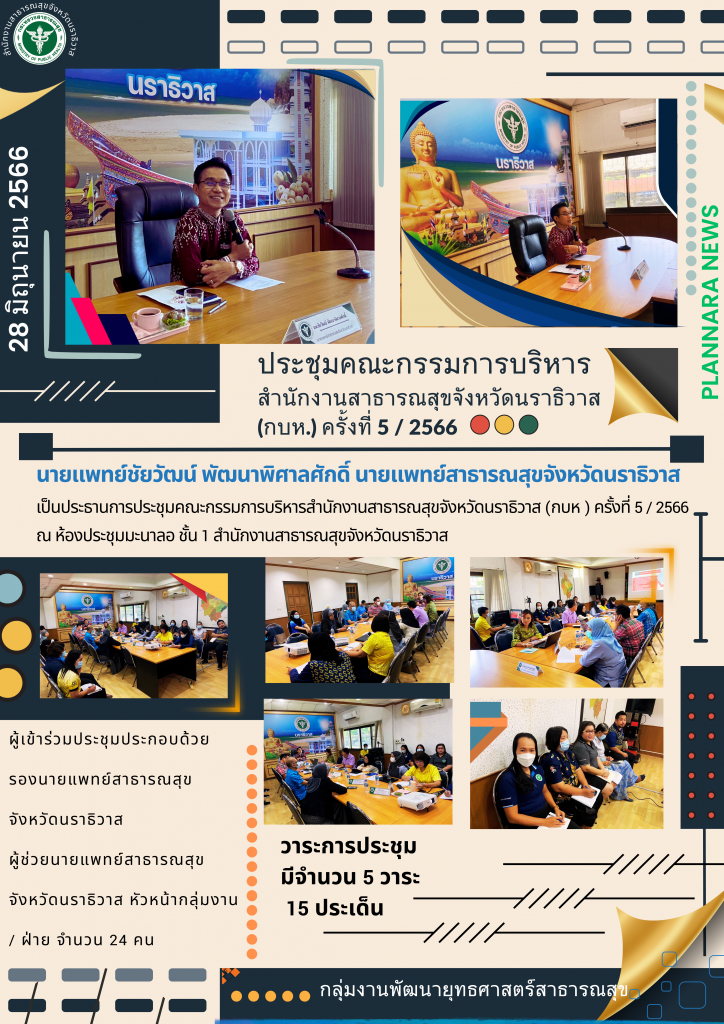 นายแพทย์ชัยวัฒน์ พัฒนาพิศาลศักดิ์ นายแพทย์สาธารณสุขจังหวัดนราธิวาส เป็นประธานการประชุมคณะกรรมการบริหารสำนักงานสาธารณสุขจังหวัดนราธิวาส (กบห ) ครั้งที่ 5 / 2566ณ ห้องประชุมมะนาลอ ชั้น 1 สำนักงานสาธารณสุขจังหวัดนราธิวาสผู้เข้าร่วมประชุมประกอบด้วย รองนายแพทย์สาธารณสุขจังหวัดนราธิวาส ผู้ช่วยนายแพทย์สาธารณสุขจังหวัดนราธิวาส หัวหน้ากลุ่มงาน / ฝ่าย จำนวน 24 คน