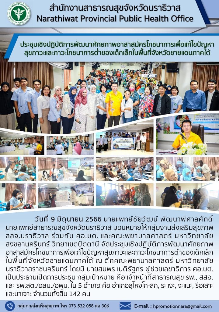 วันที่ 9 มิถุนายน 2566 นายแพทย์ชัยวัฒน์ พัฒนาพิศาลศักดิ์ นายแพทย์สาธารณสุขจังหวัดนราธิวาส มอบหมายให้กลุ่มงานส่งเสริมสุขภาพ สสจ.นราธิวาส ร่วมกับ ศอ.บต. และคณะพยาบาลศาสตร์ มหาวิทยาลัยสงขลานครินทร์ วิทยาเขตปัตตานี จัดประชุมเชิงปฏิบัติการพัฒนาศักยภาพอาสาสมัครโภชนาการเพื่อแก้ไขปัญหาสุขภาวะและภาวะโภชนาการต่ำของเด็กเล็กในพื้นที่จังหวัดชายแดนภาคใต้ ณ ตึกคณะพยาบาลศาสตร์ มหาวิทยาลัยนราธิวาสราชนครินทร์ โดยมี นายสมพร เนติรัฐกร ผู้ช่วยเลขาธิการ ศอ.บต. เป็นประธานเปิดการประชุม กลุ่มเป้าหมาย คือ เจ้าหน้าที่สาธารณสุข รพ., สสอ. และ รพ.สต./อสม./อพม. ใน 5 อำเภอ คือ อำเภอสุไหงโก-ลก, ระแงะ, จะแนะ, รือเสาะ และบาเจาะ จำนวนทั้งสิ้น 142 คน