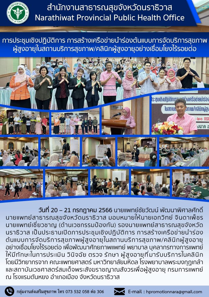 วันที่ 20 – 21 กรกฎาคม 2566 นายแพทย์ชัยวัฒน์ พัฒนาพิศาลศักดิ์ นายแพทย์สาธารณสุขจังหวัดนราธิวาส มอบหมายให้นายเอกวิทย์ จินดาเพ็ชร นายแพทย์เชี่ยวชาญ (ด้านเวชกรรมป้องกัน) รองนายแพทย์สาธารณสุขจังหวัดนราธิวาส เป็นประธานเปิดการประชุมเชิงปฏิบัติการ การสร้างเครือข่ายนำร่องต้นแบบการจัดบริการสุขภาพผู้สูงอายุในสถานบริการสุขภาพ/คลินิกผู้สูงอายุ อย่างเชื่อมโยงไร้รอยต่อ เพื่อพัฒนาศักยภาพแพทย์ พยาบาล บุคลากรทางการแพทย์ให้มีทักษะในการประเมิน วินิจฉัย ตรวจ รักษา ผู้สูงอายุที่มารับบริการในคลินิก โดยมีวิทยากรจาก คณะแพทยศาสตร์ มหาวิทยาลัยมหิดล โรงพยาบาลพระมงกุฏเกล้า และสถาบันเวชศาสตร์สมเด็จพระสังฆราชญาณสังวรเพื่อผู้สูงอายุ กรมการแพทย์ ณ โรงแรมตันหยง อำเภอเมือง จังหวัดนราธิวาส