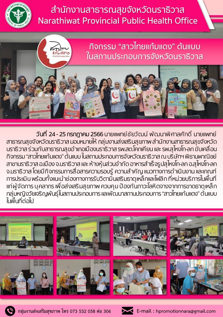 วันที่ 24 – 25 กรกฎาคม 2566 นายแพทย์ชัยวัฒน์ พัฒนาพิศาลศักดิ์ นายแพทย์สาธารณสุขจังหวัดนราธิวาส มอบหมายให้ กลุ่มงานส่งเสริมสุขภาพ สำนักงานสาธารณสุขจังหวัดนราธิวาส ร่วมกับสาธารณสุขอำเภอเมืองนราธิวาส รพ.สต.โคกเคียน และ รพ.สุไหงโก-ลก ขับเคลื่อนกิจกรรม “สาวไทยแก้มแดง” ต้นแบบ ในสถานประกอบการจังหวัดนราธิวาส ณ บริษัทฯ พิธานพาณิชย์ สาขานราธิวาส อ.เมือง จ.นราธิวาส และ ห้างหุ้นส่วนจำกัด อาหารสำเร็จรูปสุไหงโก-ลก อ.สุไหงโก-ลก จ.นราธิวาส โดยมีกิจกรรมการสื่อสารความรอบรู้ ความสำคัญ แนวทางการดำเนินงาน และเกณฑ์การประเมิน พร้อมทั้งแนะนำช่องทางการรับวิตามินเสริมธาตุเหล็กและโฟลิก ที่หน่วยบริการในพื้นที่ แก่ผู้จัดการ บุคลากร เพื่อส่งเสริมสุขภาพ ควบคุม ป้องกันภาวะโลหิตจางจากการขาดธาตุเหล็กกลุ่มหญิงวัยเจริญพันธุ์ในสถานประกอบการ และพัฒนาสถานประกอบการ “สาวไทยแก้มแดง” ต้นแบบในพื้นที่ต่อไป