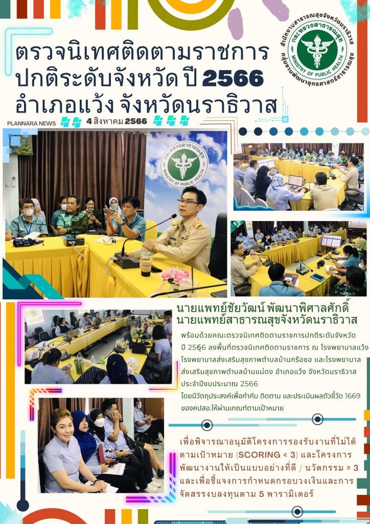นายแพทย์ชัยวัฒน์ พัฒนาพิศาลศักดิ์นายแพทย์สาธารณสุขจังหวัดนราธิวาสพร้อมด้วยคณะตรวจนิเทศติดตามราชการปกติระดับจังหวัด ปี 256ุ6 ลงพื้นที่ตรวจนิเทศติดตามราชการ ณ โรงพยาบาลแว้งโรงพยาบาลส่งเสริมสุขภาพตำบลบ้านกรือซอ และโรงพยาบาล ส่งเสริมสุขภาพตำบลบ้านแม่ดง อำเภอแว้ง จังหวัดนราธิวาส ประจำปีงบประมาณ 2566 โดยมีวัตถุประสงค์เพื่อกำกับ ติดตาม และประเมินผลตัวชี้วัด 1669 ของคปสอ.ให้ผ่านเกณฑ์ตามเป้าหมายเพื่อพิจารณาอนุมัติโครงการรองรับงานที่ไม่ได้ตามเป้าหมาย (Scoring < 3) และโครงการพัฒนางานให้เป็นแบบอย่างที่ดี / นวัตกรรม ≥ 3 และเพื่อชี้แจงการกำหนดกรอบวงเงินและการจัดสรรงบลงทุนตาม 5 พารามิเตอร์