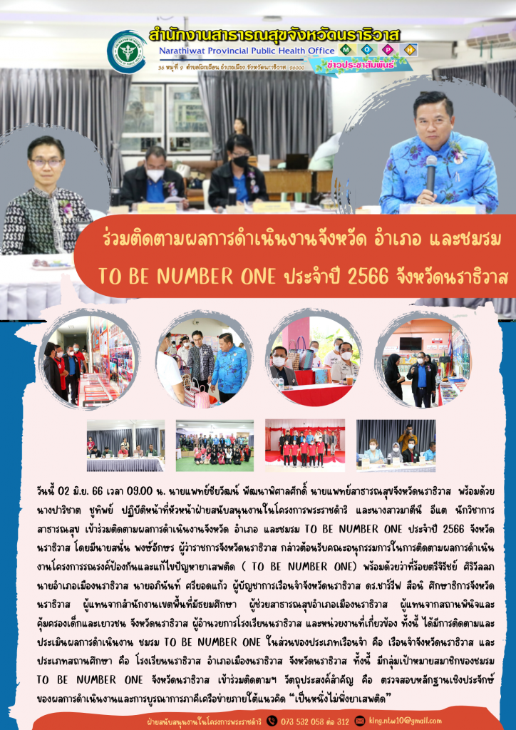 วันนี้ 02 มิ.ย. 66 เวลา 09.00 น. นายแพทย์ชัยวัฒน์ พัฒนาพิศาลศักดิ์ นายแพทย์สาธารณสุขจังหวัดนราธิวาส พร้อมด้วยนางปาริชาต ชูทิพย์ ปฏิบัติหน้าที่หัวหน้าฝ่ายสนับสนุนงานในโครงการพระราชดำริ และนางสาวมาตีนี อีแต นักวิชาการสาธารณสุข เข้าร่วมติดตามผลการดำเนินงานจังหวัด อำเภอ และชมรม TO BE NUMBER ONE ประจำปี 2566 จังหวัดนราธิวาส โดยมีนายสนั่น พงษ์อักษร ผู้ว่าราชการจังหวัดนราธิวาส กล่าวต้อนรับคณะอนุกรรมการในการติดตามผลการดำเนินงานโครงการรณรงค์ป้องกันและแก้ไขปัญหายาเสพติด ( TO BE NUMBER ONE) พร้อมด้วยว่าที่ร้อยตรีจิรัชย์ ศิริวัลลภ นายอำเภอเมืองนราธิวาส นายอภินันท์ ศรียอดแก้ว ผู้บัญชาการเรือนจำจังหวัดนราธิวาส ดร.ชาร์รีฟ สือนิ ศึกษาธิการจังหวัดนราธิวาส ผู้แทนจากสำนักงานเขตพื้นที่มัธยมศึกษา ผู้ช่วยสาธารณสุขอำเภอเมืองนราธิวาส ผู้แทนจากสถานพินิจและคุ้มครองเด็กและเยาวชน จังหวัดนราธิวาส ผู้อำนวยการโรงเรียนนราธิวาส และหน่วยงานที่เกี่ยวข้อง ทั้งนี้ ได้มีการติดตามและประเมินผลการดำเนินงาน ชมรม TO BE NUMBER ONE ในส่วนของประเภทเรือนจำ คือ เรือนจำจังหวัดนราธิวาส และประเภทสถานศึกษา คือ โรงเรียนนราธิวาส อำเภอเมืองนราธิวาส จังหวัดนราธิวาส ทั้งนี้ มีกลุ่มเป้าหมายสมาชิกของชมรม TO BE NUMBER ONE จังหวัดนราธิวาส เข้าร่วมติดตามฯ วัตถุประสงค์สำคัญ คือ ตรวจสอบหลักฐานเชิงประจักษ์ ของผลการดำเนินงานและการบูรณาการภาคีเครือข่ายภายใต้แนวคิด “เป็นหนึ่งไม่พึ่งยาเสพติด”