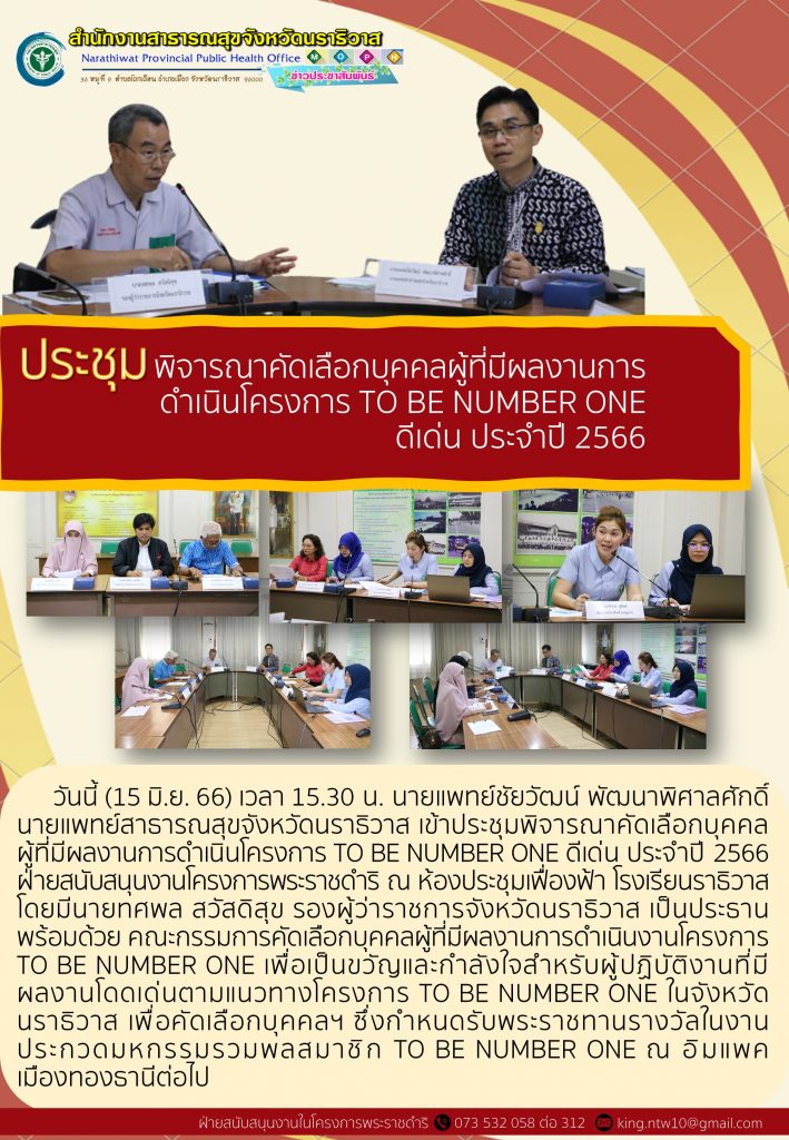 ผู้ที่มีผลงานการดำเนินโครงการ TO BE NUMBER ONE ดีเด่น ประจำปี 2566 ฝ่ายสนับสนุนงานโครงการพระราชดำริ ณ ห้องประชุมเฟื่องฟ้า โรงเรียนราธิวาส โดยมีนายทศพล สวัสดิสุข รองผู้ว่าราชการจังหวัดนราธิวาส เป็นประธาน พร้อมด้วย คณะกรรมการคัดเลือกบุคคลผู้ที่มีผลงานการดำเนินงานโครงการ TO BE NUMBER ONE เพื่อเป็นขวัญและกำลังใจสำหรับผู้ปฏิบัติงานที่มีผลงานโดดเด่นตามแนวทางโครงการ TO BE NUMBER ONE ในจังหวัดนราธิวาส เพื่อคัดเลือกบุคคลฯ ซึ่งกำหนดรับพระราชทานรางวัลในงานประกวดมหกรรมรวมพลสมาชิก TO BE NUMBER ONE ณ อิมแพค