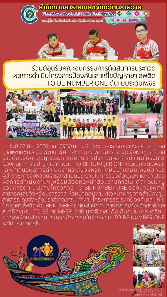 ร่วมต้อนรับคณะอนุกรรมการตัดสินการประกวดผลการดำเนินโครงการป้องกันและแก้ไขปัญหายาเสพติด TO BE NUMBER ONE ต้นแบบระดับเพชร และนำเสนอผลการดำเนินงานระดับจังหวัด โดยมีนายสนั่น พงษ์อักษร ผู้ว่าราชการจังหวัดนราธิวาส เป็นประธานในการร่วมต้อนรับฯ และนำเสนอ ผลการดำเนินงานฯ พร้อมด้วยหัวหน้าส่วนราชการในแต่ละ Setting ของการดำเนินงานโครงการ TO BE NUMBER ONE รองนายแพทย์สาธารณสุขจังหวัดนราธิวาส หัวหน้ากลุ่มงาน/หัวหน้าฝ่ายจากสำนักงานสาธารณสุขจังหวัดนราธิวาส/คณะทำงานโครงการรณรงค์ป้องกันและแก้ไขปัญหายาเสพติด (TO BE NUMBER ONE) สำนักงานสาธารณสุขจังหวัดนราธิวาส สมาชิกชมรม TO BE NUMBER ONE นราธิวาส เพื่อเก็บคะแนนและเตรียมความพร้อมเข้าร่วมประกวดกิจกรรมในโครงการ TO BE NUMBER ONE ระดับประเทศต่อไป