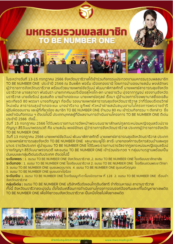 ในระหว่างวันที่ 13-15 กรกฏาคม 2566 จังหวัดนราธิวาส ณ อิมแพ็ค ฟอรั่ม เมืองทองธานี ได้ร่วมเข้าเฝ้ารับเสด็จทูลกระหม่อมหญิงอุบลรัตนราชกัญญาสิริวัฒนาพรรณวดี ภายใต้กิจกรรมประกวดงานมหกรรมรวมพลสมาชิก TO BE NUMBER ONE ประจำปี 2566 โดยการนำของนายสนั่น พงษ์อักษร ผู้ว่าราชการจังหวัดนราธิวาส พร้อมด้วยนายแพทย์ชัยวัฒน์ พัฒนาพิศาลศักดิ์ นายแพทย์สาธารณสุขจังหวัดนราธิวาส นางสุชาดา พันธ์นรา นายกเทศมนตรีเมืองสุไหงโก-ลก นายอาชวิน ปุจฉากาญจน์ แรงงานจังหวัดนราธิวาส นายชัยรัตน์ สุขสมคิด นายอำเภอจะแนะ นายแพทย์อดุลย์ เร็งมา ผู้อำนวยการโรงพยาบาลยี่งอเฉลิมพระเกียรติ 80 พรรษา นางอภิญญา ก้อเด็ม รองนายแพทย์สาธารณสุขจังหวัดนราธิวาส ว่าที่ร้อยตรีเดชวิทย์ ใหม่แย้ม สาธารณสุขอำเภอจะแนะ นางปาริชาต ชูทิพย์ หัวหน้าฝ่ายสนับสนุนงานในโครงการพระราชดำริ ผู้รับผิดชอบงาน และผู้ที่เกี่ยวข้อง สมาชิก TO BE NUMBER ONE จำนวน 80 คน เข้าร่วมกิจกรรม ฯ ดังกล่าว ซึ่งผลดำเนินกิจกรรม ฯ ดังต่อไปนี้ ประเภทบุคคลผู้ที่มีผลงานการดำเนินงานโครงการ TO BE NUMBER ONE ดีเด่น ประจำปี 2566 คือ 1.นายสนั่น พงษ์อักษร ผู้ว่าราชการจังหวัดนราธิวาส ได้รับพระราชทานรางวัลประเภท ผู้ว่าราชการจังหวัด TO BE NUMBER ONE 2.นายแพทย์ชัยวัฒน์ พัฒนาพิศาลศักดิ์ นายแพทย์สาธารณสุขจังหวัดนราธิวาส ได้รับพระราชทานรางวัลประเภท นายแพทย์สาธารณสุขจังหวัด TO BE NUMBER ONE 3.นายมะยูโซ๊ะ สาเร๊ะ นายกองค์การบริหารส่วนตำบลผดุงมาตร ได้รับพระราชทานรางวัลประเภท ผู้นำชุมชน TO BE NUMBER ONE