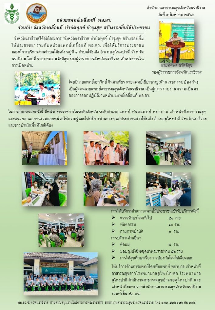 โอกาสนี้ นายทศพล สวัสดิสุข รองผู้ว่าราชการจังหวัดนราธิวาสได้ตรวจเยี่ยมและติดตามการออกให้บริการและพบปะกับประชาชนที่มารับบริการ สำหรับการออกหน่วยแพทย์ พอ.สว. เพื่อช่วยเหลือให้การรักษา ป้องกันโรค ส่งเสริมสุขภาพและฟื้นฟูสุขภาพอนามัยของประชาชนในท้องถิ่นทุรกันดาร ห่างไกลคมนาคม โดยได้รับความร่วมมือจากหลายหน่วยงานทั้งภาครัฐและเอกชนที่ร่วมในโครงการหน่วยแพทย์เคลื่อนที่ พอ.สว. ด้วยสำนึกในพระกรุณาธิคุณเป็นล้นพ้น ในปี 2566 จังหวัดนราธิวาส ร่วมกับมูลนิธิพอ.สว. จัดหน่วยแพทย์เคลื่อนที่ พอ.สว. ให้บริการแก่ประชาชนในท้องถิ่นทุรกันดารมาแล้ว