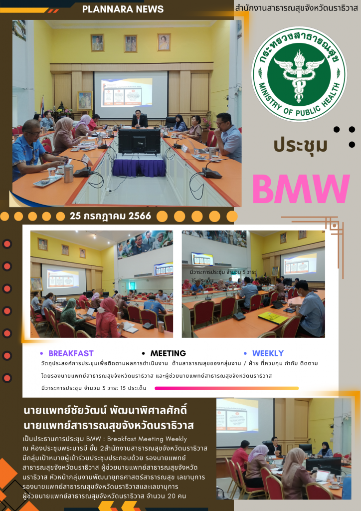 นายแพทย์ชัยวัฒน์ พัฒนาพิศาลศักดิ์ นายแพทย์สาธารณสุขจังหวัดนราธิวาสเป็นประธานการประชุม BMW : Breakfast Meeting Weeklyณ ห้องประชุมพระบารมี ชั้น 2สำนักงานสาธารณสุขจังหวัดนราธิวาส มีกลุ่มเป้าหมายผู้เข้าร่วมประชุมประกอบด้วย รองนายแพทย์สาธารณสุขจังหวัดนราธิวาส ผู้ช่วยนายแพทย์สาธารณสุขจังหวัดนราธิวาส หัวหน้ากลุ่มงานพัฒนายุทธศาสตร์สาธารณสุข เลขานุการรองนายแพทย์สาธารณสุขจังหวัดนราธิวาสและเลขานุการ ผู้ช่วยนายแพทย์สาธารณสุขจังหวัดนราธิวาส จำนวน 20 คนวัตถุประสงค์การประชุมเพื่อติดตามผลการดำเนินงาน ด้านสาธารณสุขของกลุ่มงาน / ฝ่าย ที่ควบคุม กำกับ ติดตามโดยรองนายแพทย์สาธารณสุขจังหวัดนราธิวาส และผู้ช่วยนายแพทย์สาธารณสุขจังหวัดนราธิวาส มีวาระการประชุม จำนวน 3 วาระ 15 ประเด็น