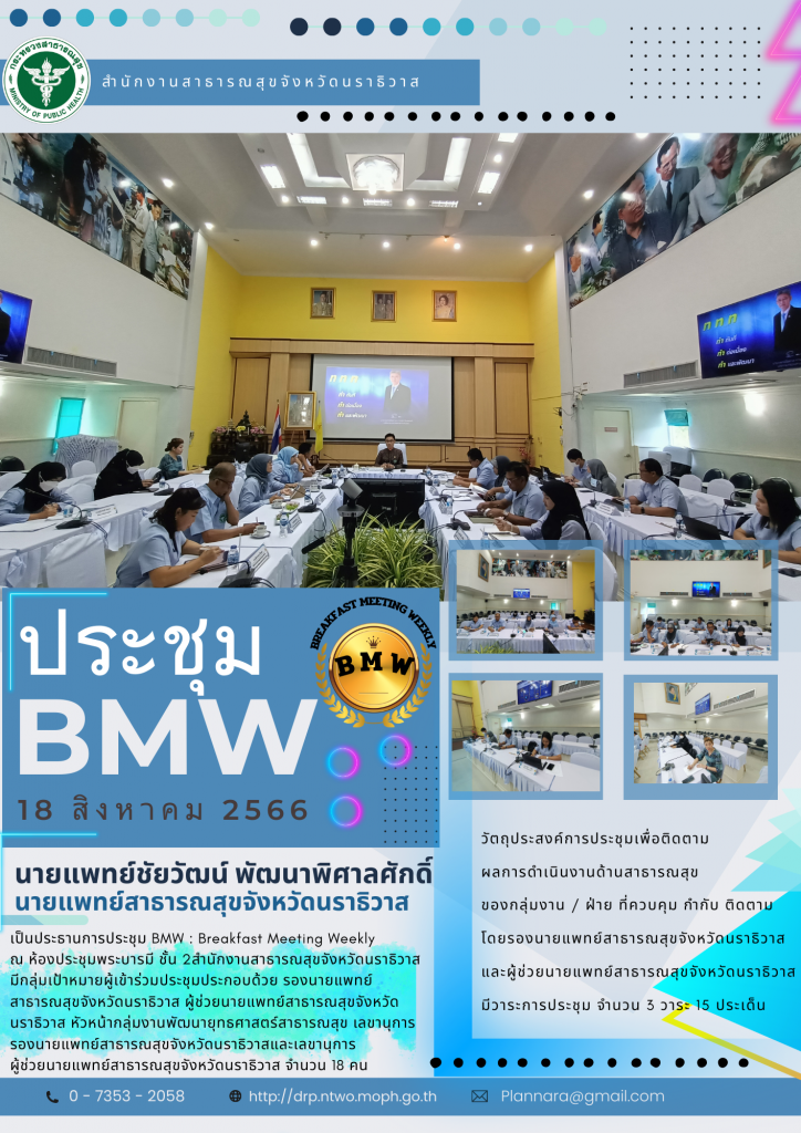 นายแพทย์ชัยวัฒน์ พัฒนาพิศาลศักดิ์ นายแพทย์ชัยวัฒน์ พัฒนาพิศาลศักดิ์เป็นประธานการประชุม BMW : Breakfast Meeting Weekly ณ ห้องประชุมพระบารมี ชั้น 2สำนักงานสาธารณสุขจังหวัดนราธิวาส มีกลุ่มเป้าหมายผู้เข้าร่วมประชุมประกอบด้วย รองนายแพทย์สาธารณสุขจังหวัดนราธิวาส ผู้ช่วยนายแพทย์สาธารณสุขจังหวัดนราธิวาส หัวหน้ากลุ่มงานพัฒนายุทธศาสตร์สาธารณสุข เลขานุการรองนายแพทย์สาธารณสุขจังหวัดนราธิวาสและเลขานุการผู้ช่วยนายแพทย์สาธารณสุขจังหวัดนราธิวาส จำนวน 18 คนวัตถุประสงค์การประชุมเพื่อติดตามผลการดำเนินงานด้านสาธารณสุขของกลุ่มงาน / ฝ่าย ที่ควบคุม กำกับ ติดตามโดยรองนายแพทย์สาธารณสุขจังหวัดนราธิวาสและผู้ช่วยนายแพทย์สาธารณสุขจังหวัดนราธิวาส มีวาระการประชุม จำนวน 3 วาระ 15 ประเด็น