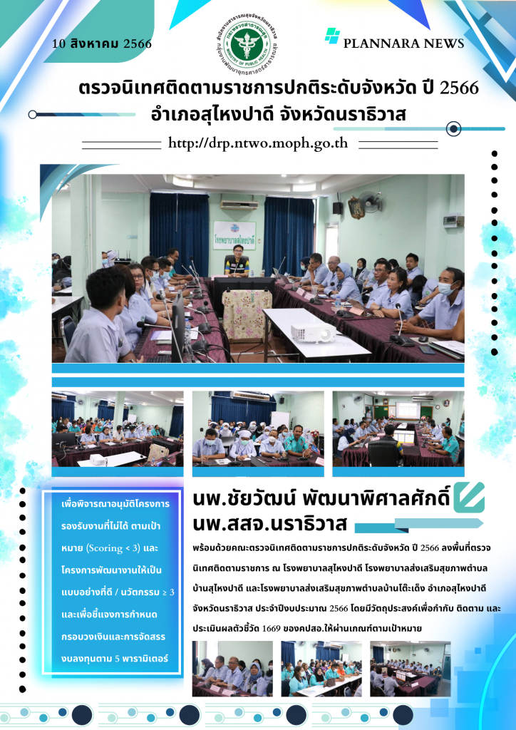 นพ.ชัยวัฒน์ พัฒนาพิศาลศักดิ์ นพ.สสจ.นราธิวาส พร้อมด้วยคณะตรวจนิเทศติดตามราชการปกติระดับจังหวัด ปี 2566 ลงพื้นที่ตรวจนิเทศติดตามราชการ ณ โรงพยาบาลสุไหงปาดี โรงพยาบาลส่งเสริมสุขภาพตำบล บ้านสุไหงปาดี และโรงพยาบาลส่งเสริมสุขภาพตำบลบ้านโต๊ะเด็ง อำเภอสุไหงปาดี จังหวัดนราธิวาส ประจำปีงบประมาณ 2566 โดยมีวัตถุประสงค์เพื่อกำกับ ติดตาม และประเมินผลตัวชี้วัด 1669 ของคปสอ.ให้ผ่านเกณฑ์ตามเป้าหมาย เพื่อพิจารณาอนุมัติโครงการรองรับงานที่ไม่ได้ ตามเป้าหมาย (Scoring < 3) และโครงการพัฒนางานให้เป็นแบบอย่างที่ดี / นวัตกรรม ≥ 3 และเพื่อชี้แจงการกำหนดกรอบวงเงินและการจัดสรรงบลงทุนตาม 5 พารามิเตอร์