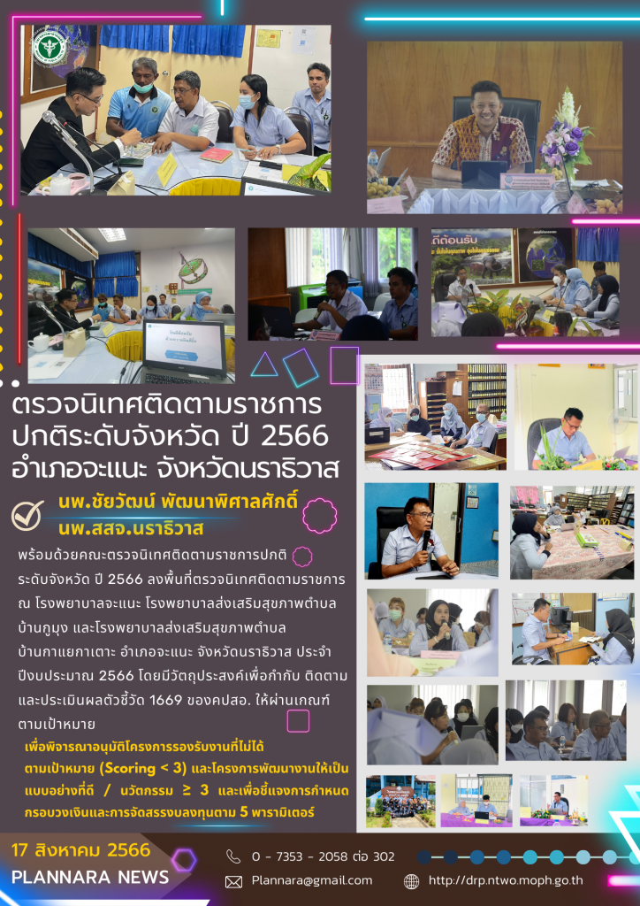 นพ.ชัยวัฒน์ พัฒนาพิศาลศักดิ์ นพ.สสจ.นราธิวาสพร้อมด้วยคณะตรวจนิเทศติดตามราชการปกติระดับจังหวัด ปี 2566 ลงพื้นที่ตรวจนิเทศติดตามราชการ ณ โรงพยาบาลจะแนะ โรงพยาบาลส่งเสริมสุขภาพตำบลบ้านกูมุง และโรงพยาบาลส่งเสริมสุขภาพตำบลบ้านกาแยกาเตาะ อำเภอจะแนะ จังหวัดนราธิวาส ประจำปีงบประมาณ 2566 โดยมีวัตถุประสงค์เพื่อกำกับ ติดตาม และประเมินผลตัวชี้วัด 1669 ของคปสอ. ให้ผ่านเกณฑ์ตามเป้าหมายเพื่อพิจารณาอนุมัติโครงการรองรับงานที่ไม่ได้