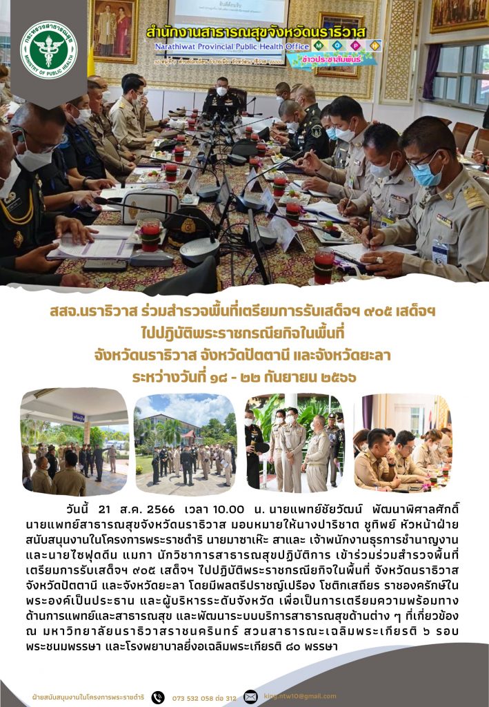 วันนี้ 21 ส.ค. 2566 เวลา 10.00 น. นายแพทย์ชัยวัฒน์ พัฒนาพิศาลศักดิ์ นายแพทย์สาธารณสุขจังหวัดนราธิวาส มอบหมายให้นางปาริชาต ชูทิพย์ หัวหน้าฝ่ายสนับสนุนงานในโครงการพระราชดำริ นายมาซาเห๊ะ สาและ เจ้าพนักงานธุรการชำนาญงาน และนายไซฟุดดีน แมกา นักวิชาการสาธารณสุขปฏิบัติการ เข้าร่วมร่วมสำรวจพื้นที่เตรียมการรับเสด็จฯ ๙๐๕ เสด็จฯ ไปปฎิบัติพระราชกรณียกิจในพื้นที่ จังหวัดนราธิวาส จังหวัดปัตตานี และจังหวัดยะลา โดยมีพลตรีปราชญ์เปรือง โชติกเสถียร ราชองครักษ์ในพระองค์เป็นประธาน และผู้บริหารระดับจังหวัด เพื่อเป็นการเตรียมความพร้อมทาง ด้านการแพทย์และสาธารณสุข และพัฒนาระบบบริการสาธารณสุขด้านต่าง ๆ ที่เกี่ยวข้อง ณ มหาวิทยาลัยนราธิวาสราชนครินทร์ สวนสาธารณะเฉลิมพระเกียรติ ๖ รอบ พระชนมพรรษา และโรงพยาบาลยี่งอเฉลิมพระเกียรติ ๘๐ พรรษา