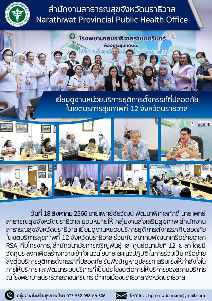 วันที่ 18 สิงหาคม 2566 นายแพทย์ชัยวัฒน์ พัฒนาพิศาลศักดิ์ นายแพทย์สาธารณสุขจังหวัดนราธิวาส มอบหมายให้ กลุ่มงานส่งเสริมสุขภาพ สำนักงานสาธารณสุขจังหวัดนราธิวาส เยี่ยมดูงานหน่วยบริการยุติการตั้งครรภ์ที่ปลอดภัยในเขตบริการสุขภาพที่ 12 จังหวัดนราธิวาส ร่วมกับ สมาคมพัฒนาเครือข่ายอาสา RSA, ทีมโครงการ, สำนักอนามัยการเจริญพันธุ์ และ ศูนย์อนามัยที่ 12 ยะลา โดยมีวัตถุประสงค์เพื่อสร้างความเข้าใจแนวนโยบายและแนวปฏิบัติในการร่วมเป็นเครือข่ายส่งต่อบริการยุติการตั้งครรภ์ที่ปลอดภัย รับฟังปัญหาอุปสรรค เสริมแรงให้กำลังใจในการให้บริการ และพัฒนาระบบบริการที่เป็นประโยชน์ต่อการให้บริการของสถานบริการ ณ โรงพยาบาลนราธิวาสราชนครินทร์ อำเภอเมืองนราธิวาส จังหวัดนราธิวาส