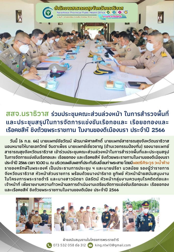 วันนี้ (6 ก.ย. 66) นายแพทย์ชัยวัฒน์ พัฒนาพิศาลศักดิ์ นายแพทย์สาธารณสุขจังหวัดนราธิวาส มอบหมายให้นายเอกวิทย์ จินดาเพ็ชร นายแพทย์เชี่ยวชาญ (ด้านเวชกรรมป้องกัน) รองนายแพทย์สาธารณสุขจังหวัดนราธิวาส เข้าร่วมประชุมคณะส่วนล่วงหน้า ในการสำรวจพื้นที่และประชุมสรุปในการจัดการแข่งขันกอและ เรือยอกอง และเรือคชสีห์ ชิงถ้วยพระราชทาน ในงานของดีเมือง ประจำปี 2566 เวลา 10.00 น. ณ บริเวณพลับพลาที่ประทับริมเขื่อนท่าพระสาย โดยมีพลตรีศิระวุธ วะนำ้ค้าง ราชองครักษ์ในพระองค์ เป็นประธานการประชุม ฯ และนายปรีชา นวลน้อย รองผู้ว่าราชการจังหวัดนราธิวาส หัวหน้าส่วนราชการ พร้อมด้วยนางปาริชาต ชูทิพย์ หัวหน้าฝ่ายสนับสนุนงานในโครงการพระราชดำริ และนางสาวนิตยา นิลรัตน์ หัวหน้ากลุ่มงานควบคุมโรคติดต่อ และเจ้าหน้าที่ เพื่อรายงานความก้าวหน้าผลการดำเนินงานเตรียมจัดการแข่งขันกอและ เรือยอกอง และเรือคชสีห์ ชิงถ้วยพระราชทาน ในงานของดีเมือง ประจำปี 2566